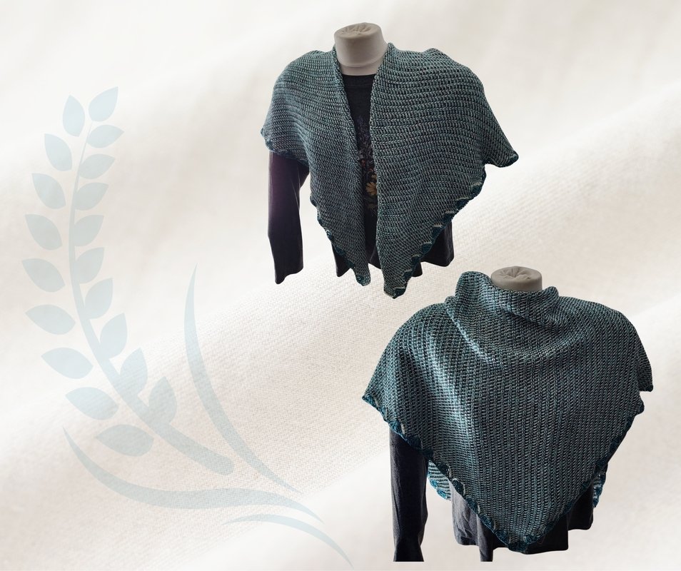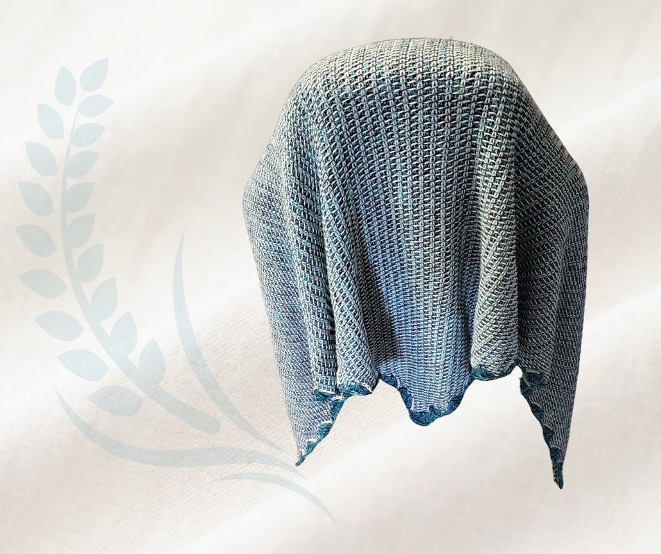 "This beautiful triangular shawl is crocheted in Tunisian simple stitch using two colors, creating a stylish tweed effect. The elegant shell border adds a special touch. This project is designed for advanced crocheters who want to experiment with two-color techniques and expand their skills. The result is a unique accessory—perfect not only for cool days or as a stylish highlight for any outfit."