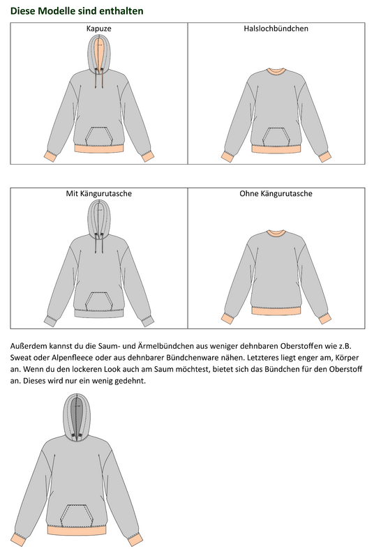 For a sporty look, you can add a kangaroo pocket to the front. The hem cuffs can be made from either the main fabric or stretchy ribbing or jersey fabric.