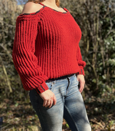 The sweater is a perfect harbinger of spring. The shoulder strap and the subtle color changes make the sweater something very special.