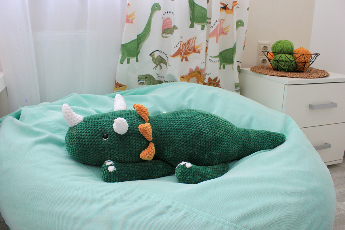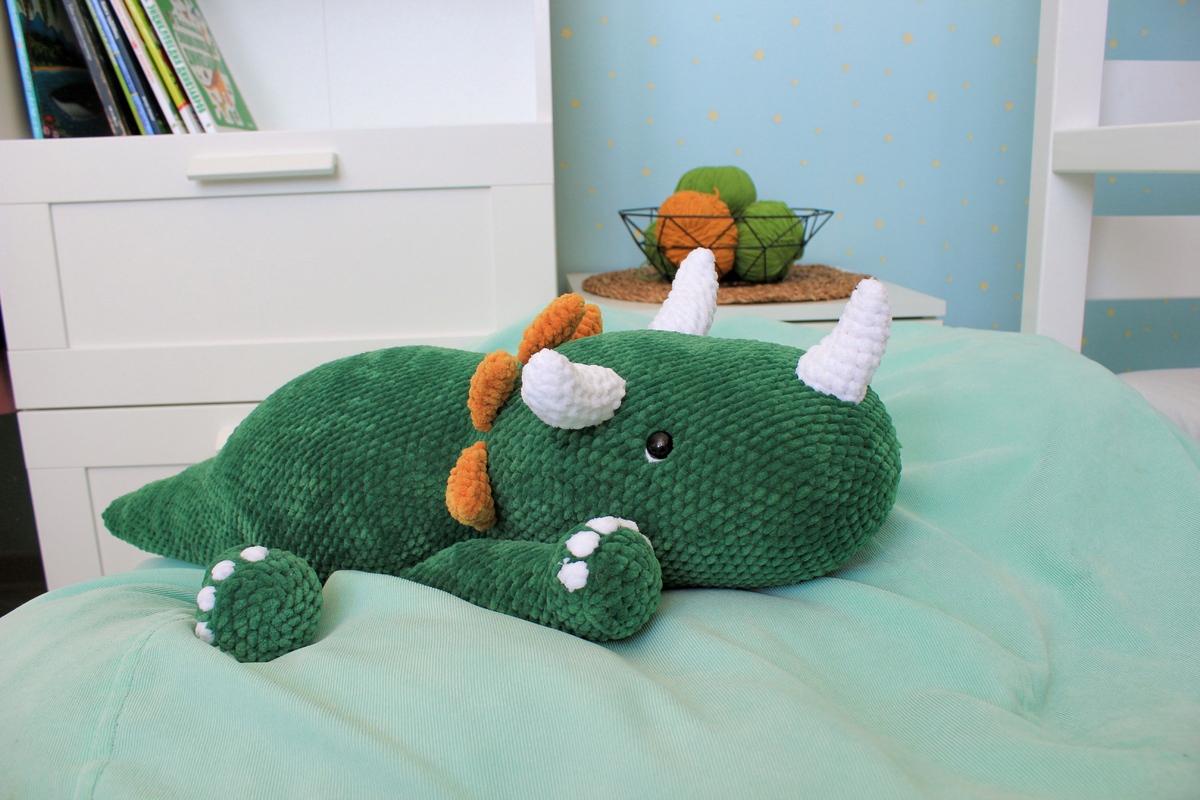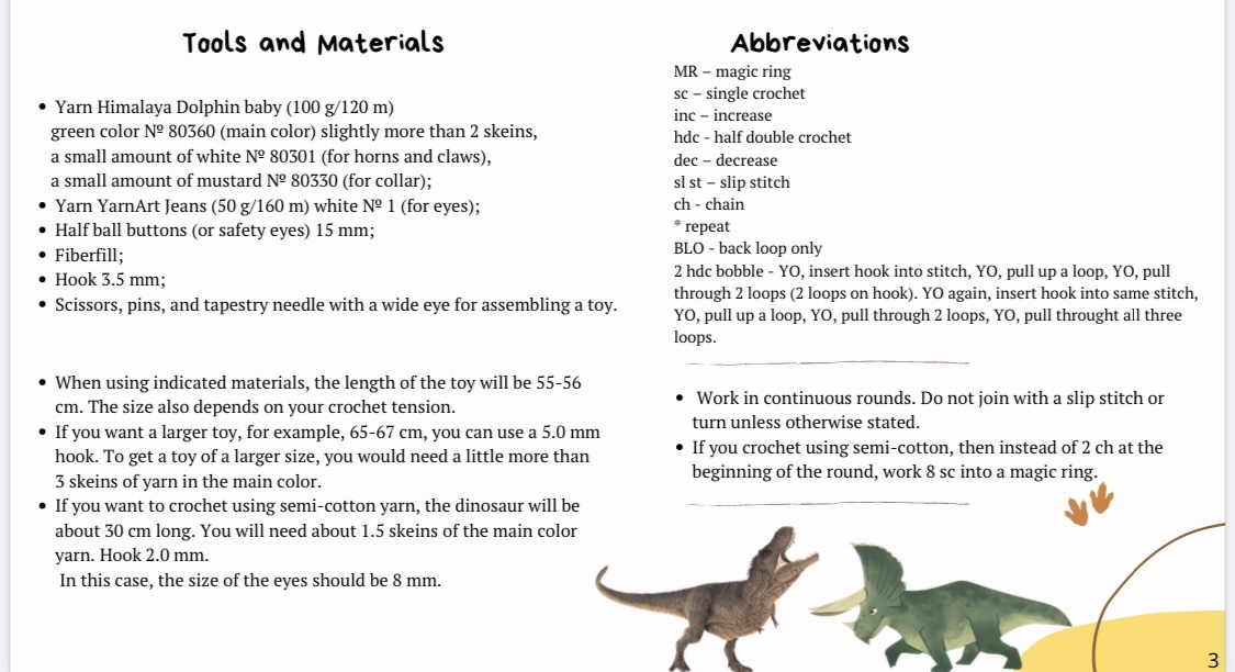If you want to crochet using semi-cotton yarn, the dinosaur will be about 30 cm long. You will need about 1.5 skeins of the main color yarn. Hook 2.0 mm.