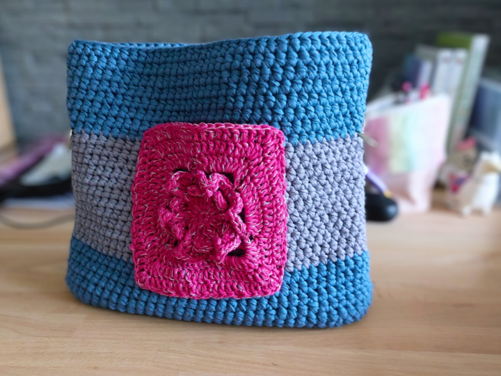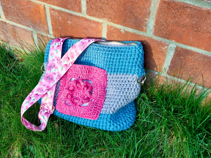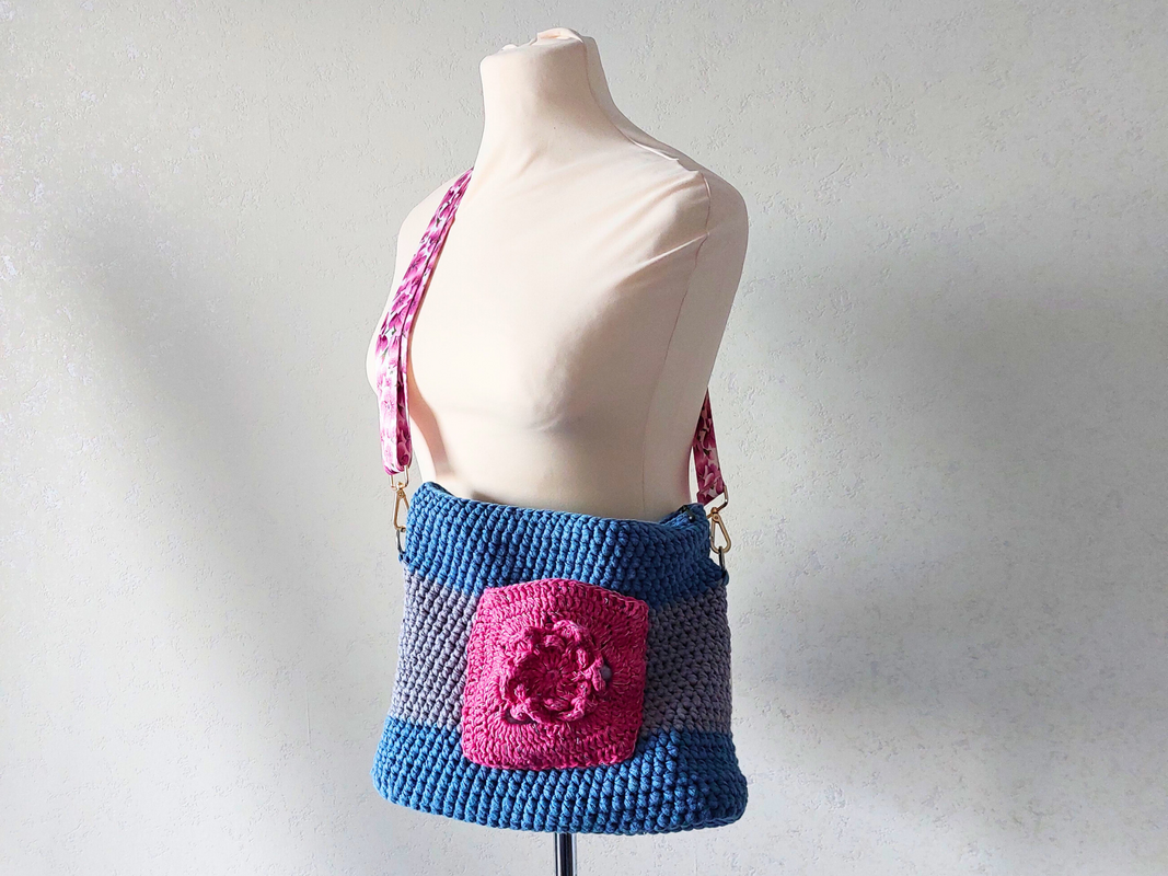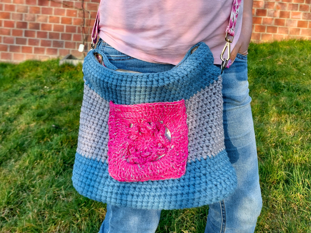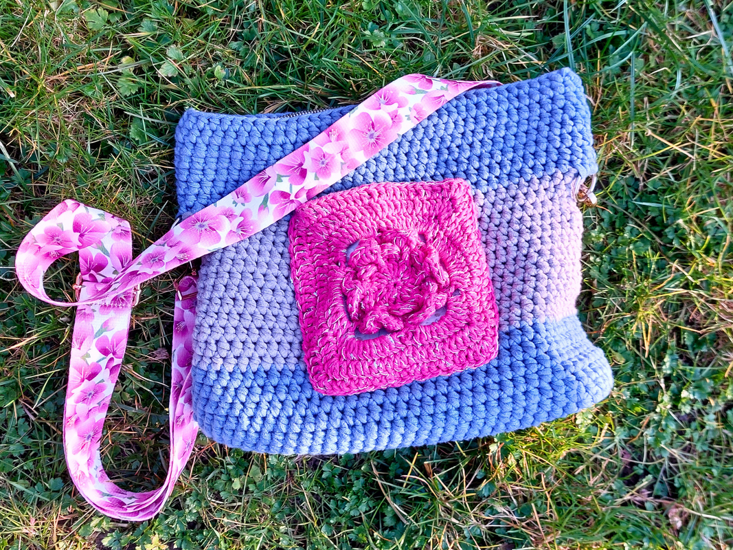 This stylish bag is perfect for spring weather. The attached granny square design makes it a real eye-catcher. There are no limits to the color combinations, and the granny square can also be used for other ideas.