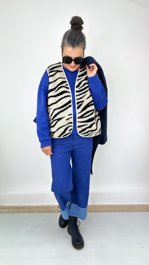 Die Basic-Weste ist schnell und einfach genäht und damit auch ein tolles Projekt für Anfängerinnen und Einsteiger. Die Weste wird offen getragen und rundherum mit Schrägband eingefasst. Du kannst sie aber auch mit Futter nähen – in diesem Fall ist sogar eine Wendevariante möglich, sodass du je nach Tagesform mal die eine, mal die andere Seite außen tragen kannst. Die optionale Teilungsmöglichkeit im Vorderteil verleiht deiner Weste noch ein bisschen mehr Pfiff. Bei der Stoffwahl bist du völlig frei. Wie wäre es zum Beispiel mit einem coolen Statement-Teil aus zotteligem Plüschstoff? Natürlich kannst du dich aber auch für einen schlichteren Look entscheiden – ganz, wie es dir gefällt.