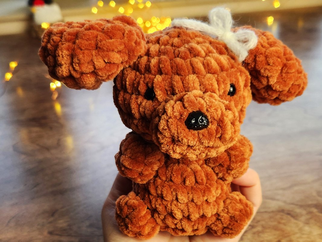 Crochet the head and body as a single piece, then sew on the ears, muzzle, and legs.
