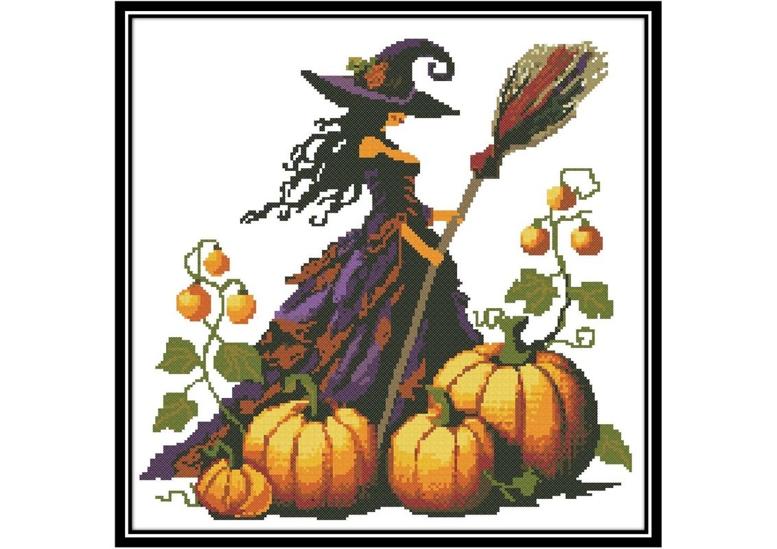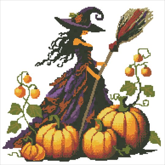 Add a magical touch to your cross stitch collection with this professional and detailed cross stitch pattern featuring a beautifully illustrated witch standing amidst pumpkins and holding a broom. Perfect for Halloween enthusiasts and lovers of mystical art, this pattern is designed for advanced and intermediate stitchers seeking a high-quality and intricate project.