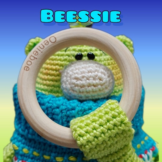 Hallo, ich bin Beessie, ein süßes, buntes Kuscheltier und Tröster für deinen Augapfel. In der einen Hand halte ich einen sicheren Oenieboe-Holzbeißring und mit der anderen Hand klappert er, wenn man ihn bewegt.