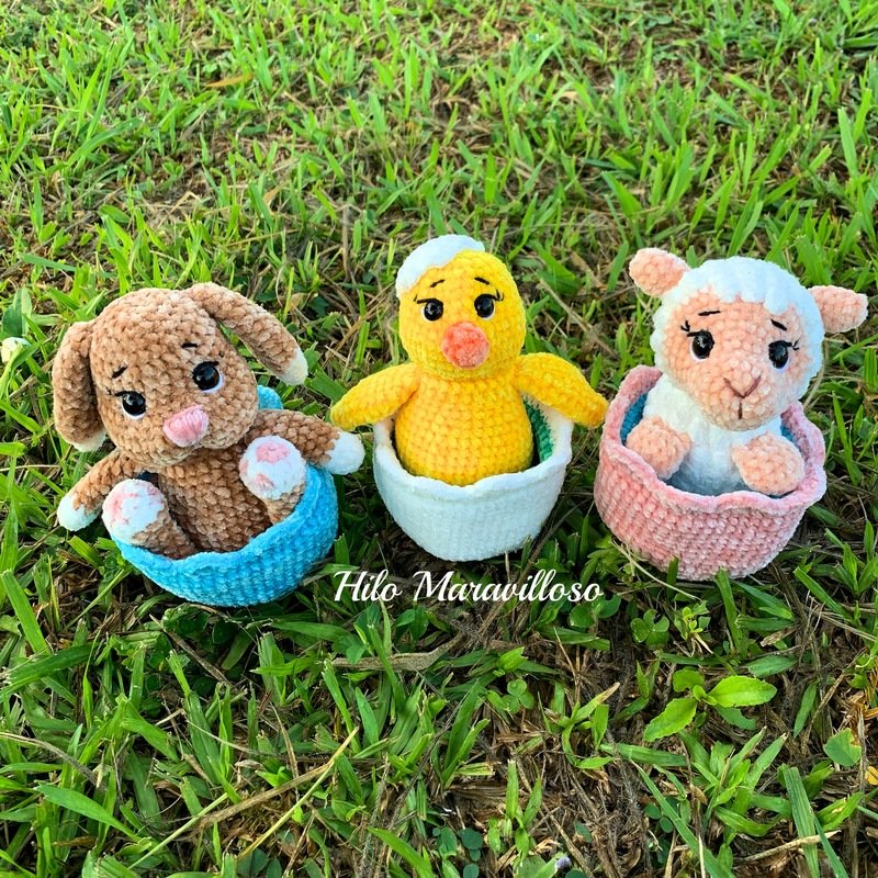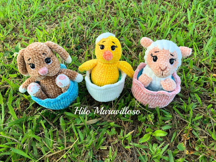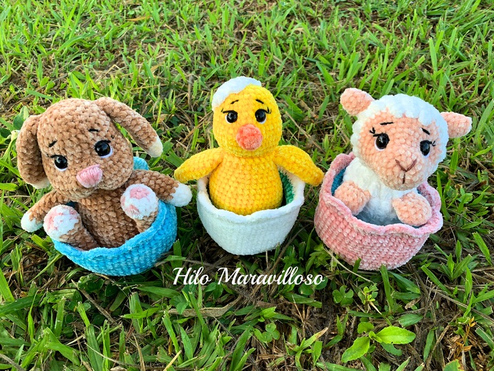 It's nice to have you here. With these crochet pattern, you can conjure up a chick, a rabbit, a sheep and an eggshell.