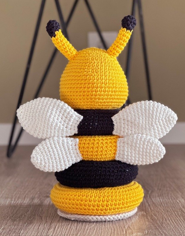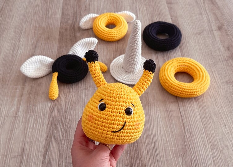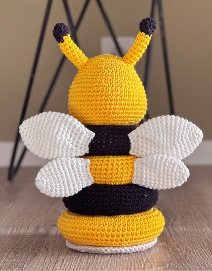 Easy-to-follow crochet instructions with pictures for a bee stacking toy that will make all children's eyes light up. Whether for your own little ones or as a gift, this stacking toy is always an eye-catcher.