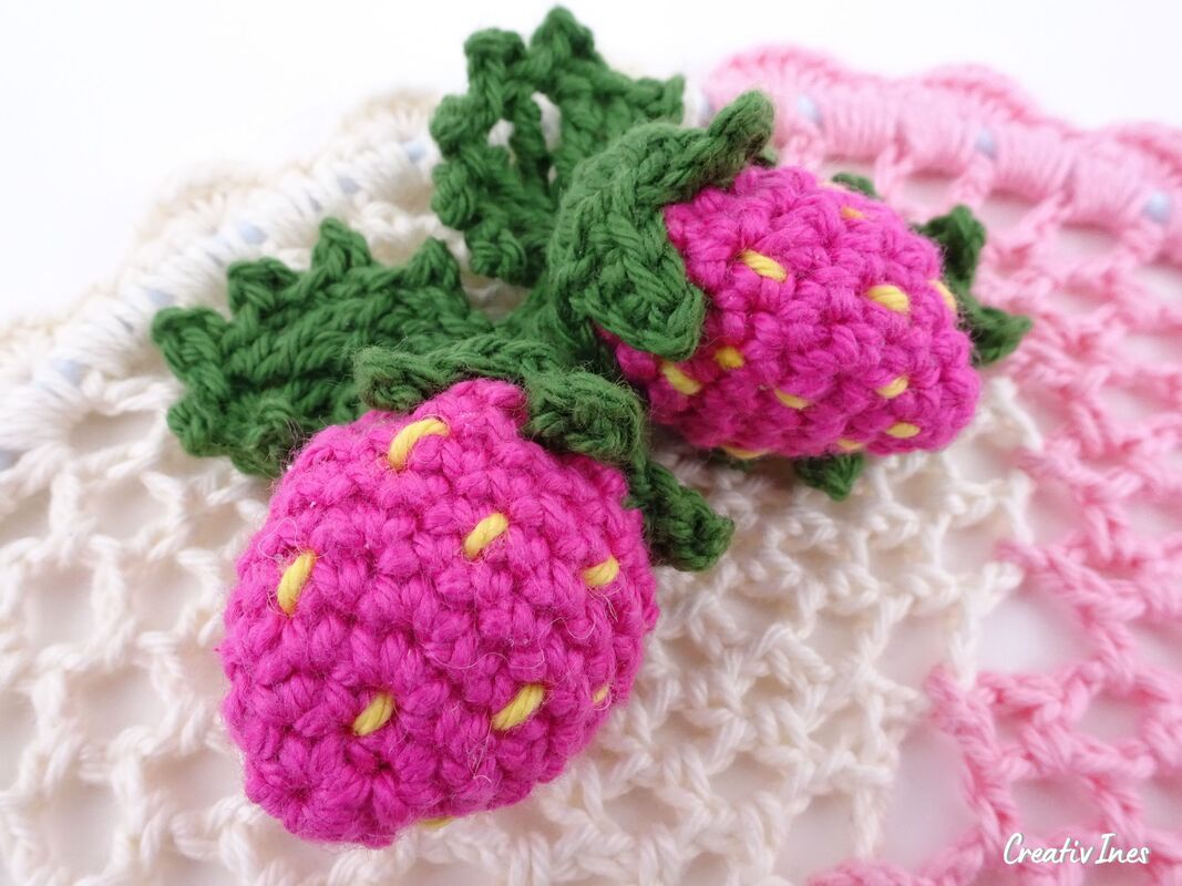 Eine Häkelanleitung für das Yin und Yang Motiv (inkl. Blume, Blatt und Ranke) in einem Ring und eine Häkelanleitung für Erdbeeren in 3 Größen, mit Blatt und Blüte. Beide Anleitungen enthalten zusätzliche Tipps und Anwendungsideen, außerdem auch Häkelschriften.