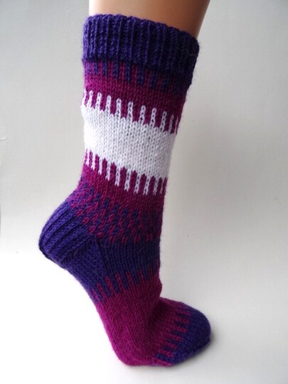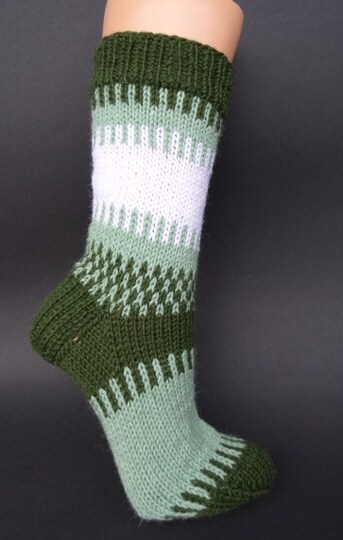 knitting pattern for socks in three colours in size 36/37. For these socks you should have practice in knitting socks, knitting in the round and be able to knit in two colours. The pattern is over 3 pages and contain a detailed description of how to knit.