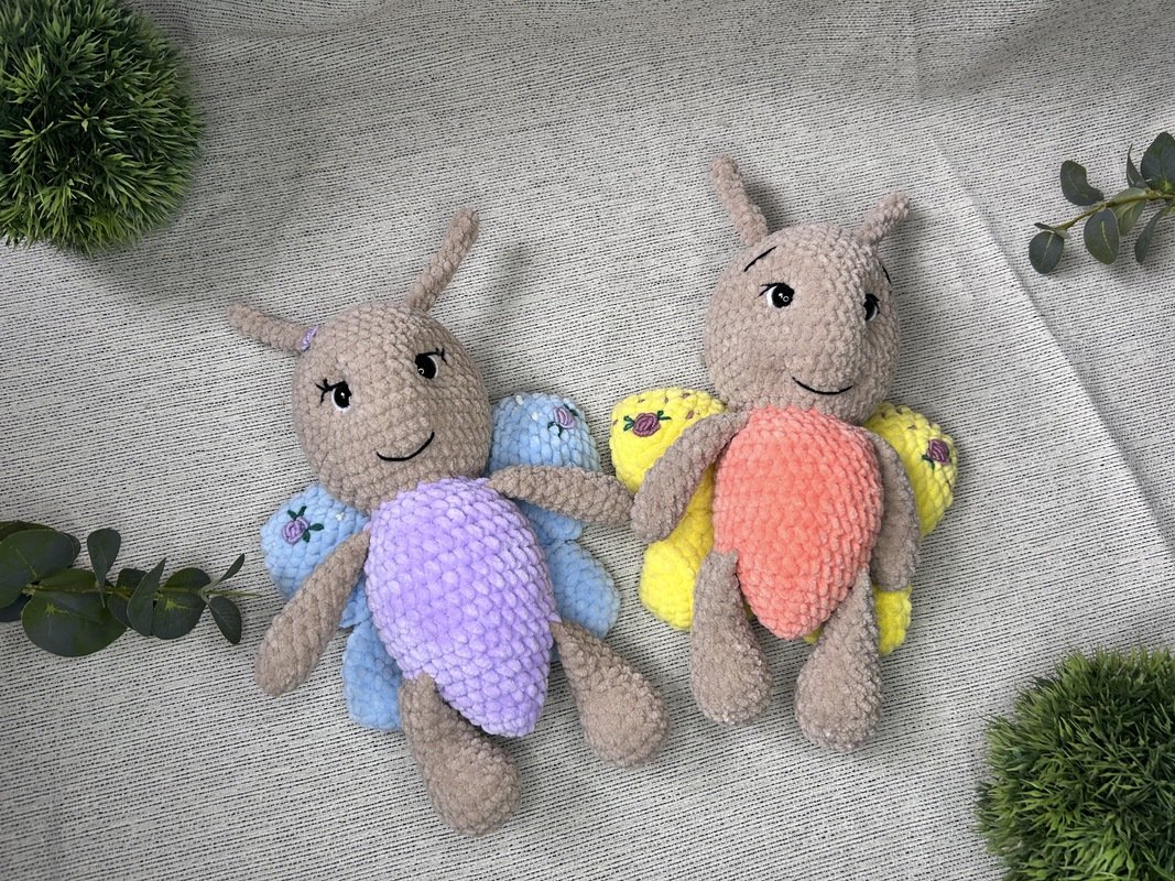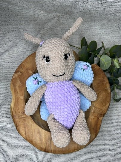 Marie ist mit Chenillewolle gehäkelt und ist ca. 34 cm Groß vom Fühler bis zum Fuß.