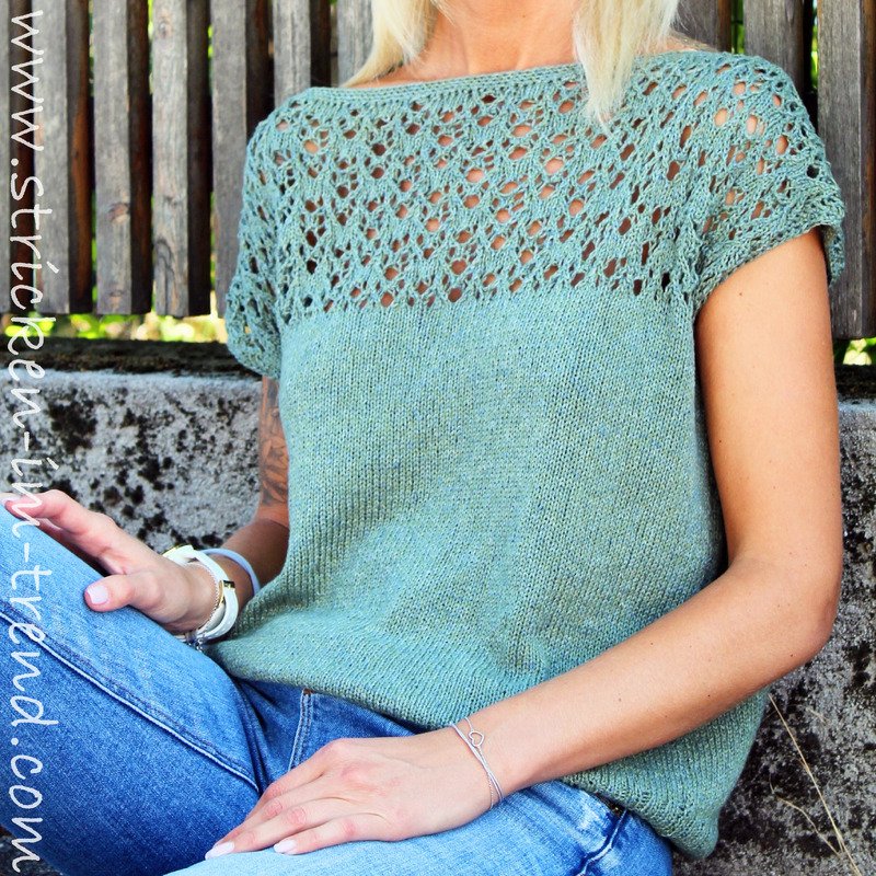 The knit top “MonteNegro #1” is the perfect way to step into summer: a feminine lace pattern at the shoulders meets clean stockinette in the body – for a stylish look with clear lines.