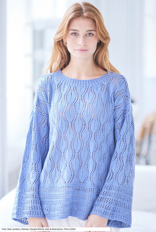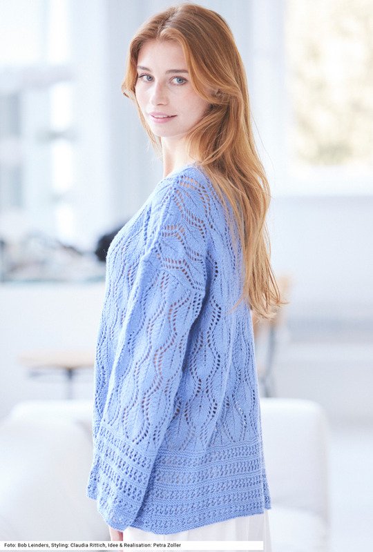 Dieser Pullover mit weiten, geraden Ärmeln begeistert mit seiner Kombination aus zwei verschiedenen Mustern – mal verspielt in einem Blatt-Ajourmuster, mal geradlinig mit einem Netzmuster, das ergibt eine dynamische Verbindung. Der etwas breitere Halsausschnitt lässt Platz für eine kurze Halskette. Er wird mit einer Rippenmuster-Blende umrandet. Der superweiche Griff des Gestricks kommt von dem Garn aus halb Bio-Baumwolle, halb Soja, das außerdem einen seidigen Glanz hat. Eine Anleitung steht für die Größen 38/40 und 44/46 sowie 50/52 zur Verfügung.