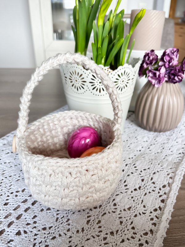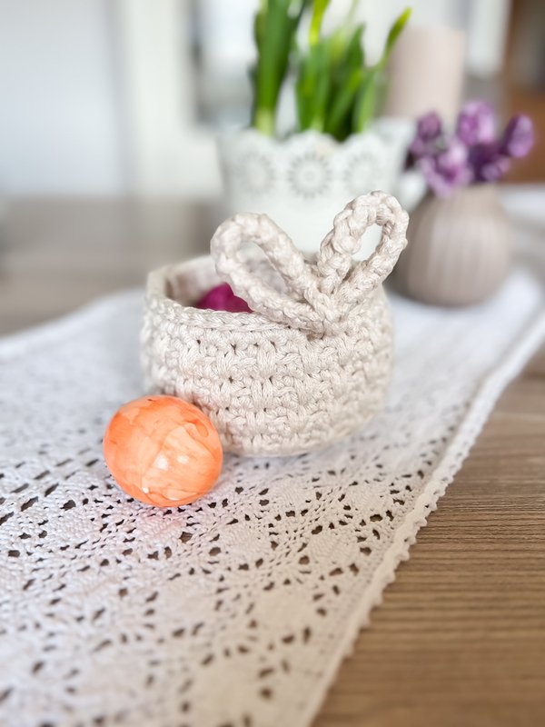 Das Besondere an diesen Körbchen ist, dass du den Henkel später auch zur Schleife binden kannst. So kannst du dein Osterkörbchen später auch als tolles Utensilo nutzen.