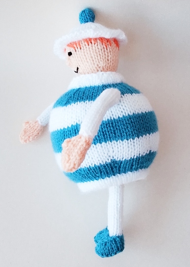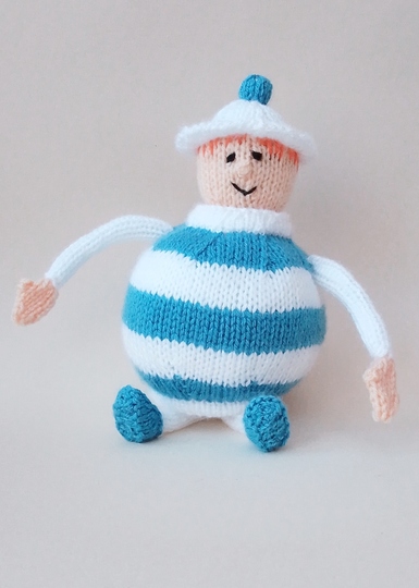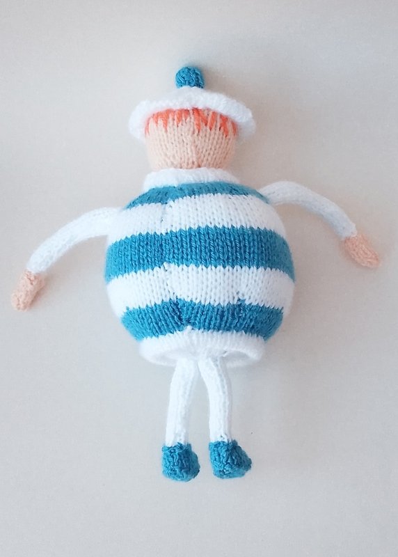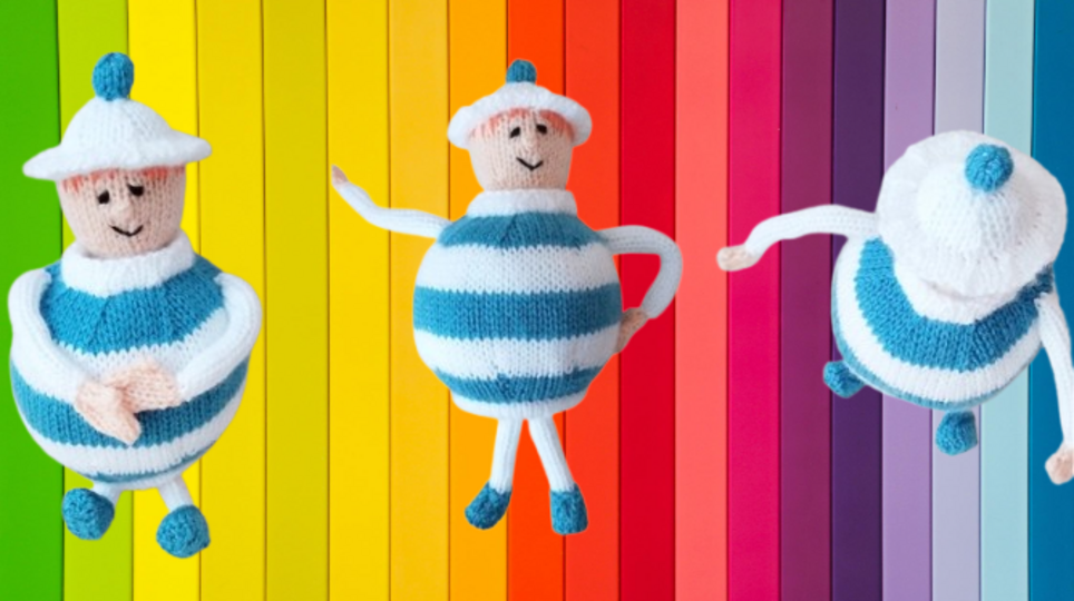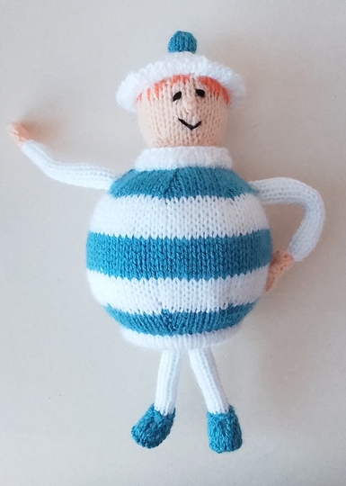 The doll is an ode to the beloved nursery rhyme, embodying the form of a teapot with its short and stout silhouette. Its main body showcases lively blue and white stripes reminiscent of iconic Cornishware ceramics, infusing the design with a touch of classic charm. Designed with movable arms and legs, the doll can sit, stand, or even strike playful poses that align with the rhyme’s actions. Completing the teapot-inspired aesthetic, its hat is cleverly crafted to mimic the lid of a teapot.