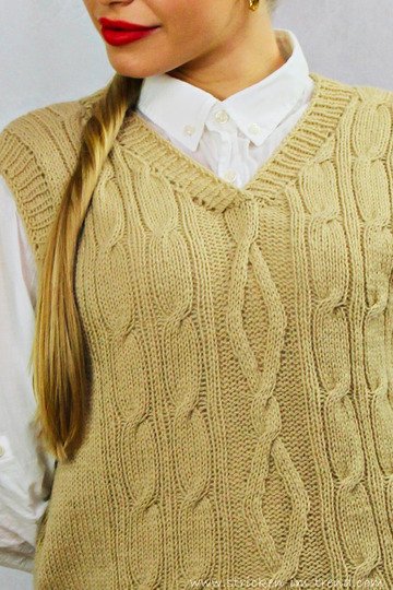 This vest is worked bottom-up, with a seamless ribbed hem and simple finishing. The cable motif is placed only on the front, while the back is worked in plain stockinette for a clean look and easy knitting rhythm.
