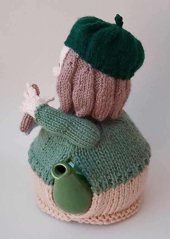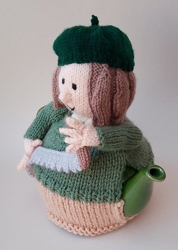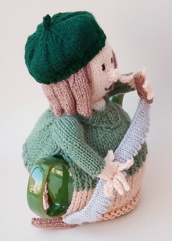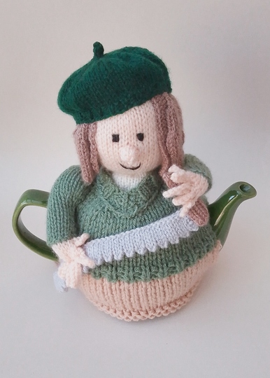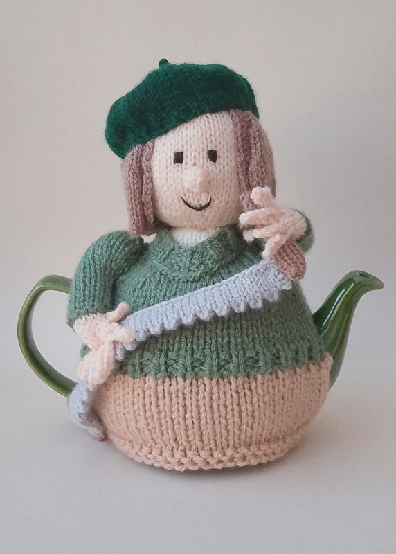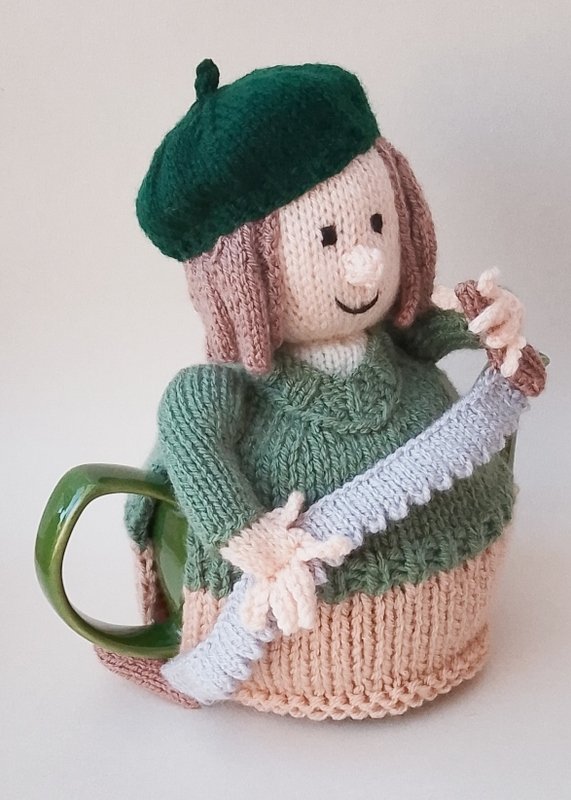 This tea cosy transforms your teapot, dressed in her forestry uniform with a smart green beret, beige trousers, and a practical green sweater. In her hands, she grips a long two-woman crosscut saw, ready to fell a tree; though she’ll need another Lumber Jill to lend a hand!