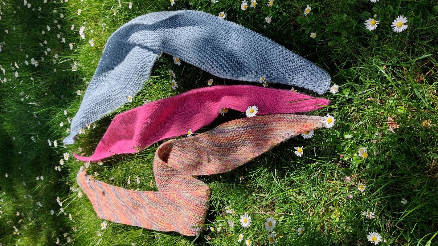 Sample 2 (pink): 16 sts x 34 rows = 10 x 10 cm (4 x 4 inches) in garter stitch, measured after blocking