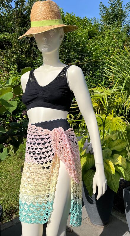 Benötigt werden ab ca.700m 4-fädiges Garn für den Pareo, so wie er auf dem Bild zu sehen ist (Größe 40-42).