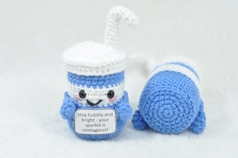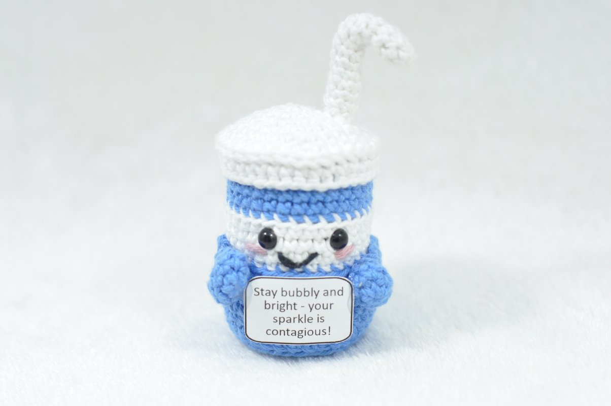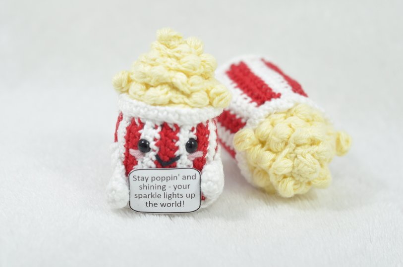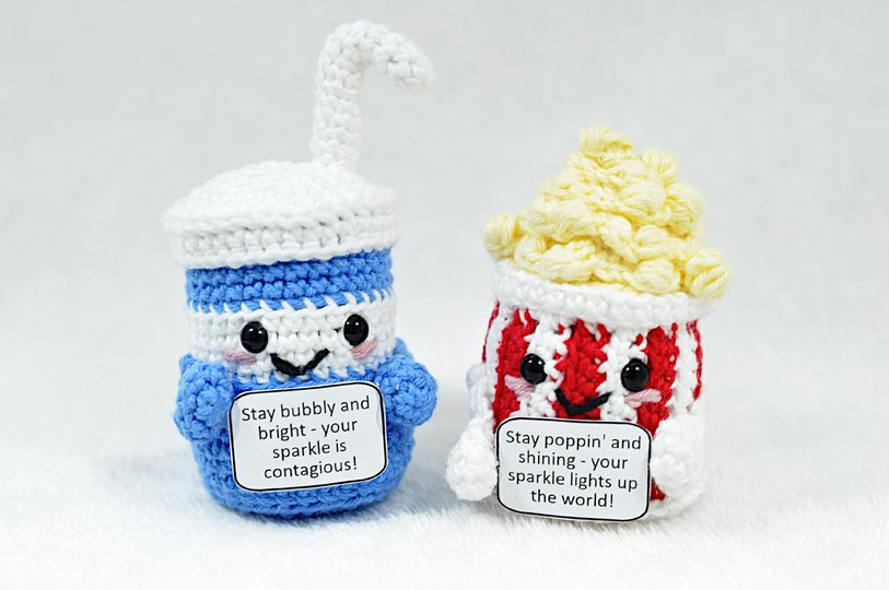 This charming crochet pattern is sure to lift your spirits: a cute popcorn and a cheerful soda – each holding a motivational quote in their hands!