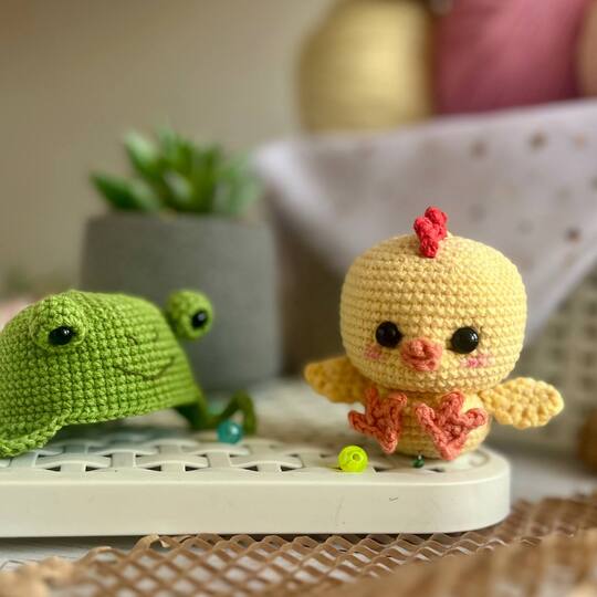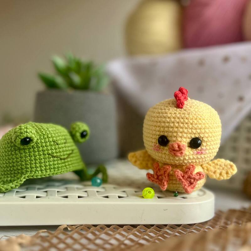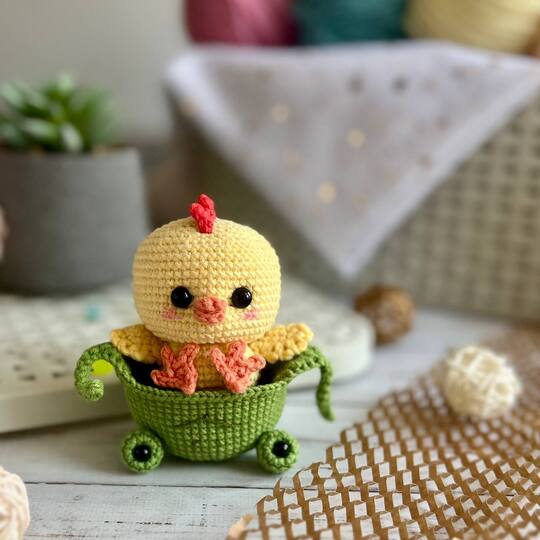 This is a detailed, beginner-friendly crochet pattern to make your own Chirpy the Chick – a cute little bird wearing a funny frog hat.