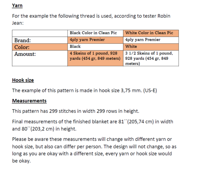 The pattern is 299 stitches wide and 299 rows high, and the approximate finished measurements will be 80 inches high (203.2 cm) and 81 inches wide (205.74 cm) using a 3.75 mm hook and 4-ply Premier yarn.