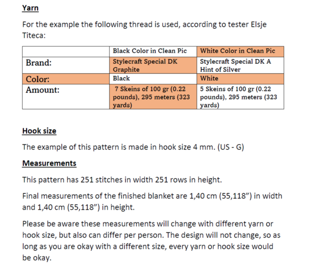 The yarn measurements and amounts indicated are for a 4mm hook. If you use a different type of yarn or hook size, the finished work measurements will not be the same as indicated in the pattern.