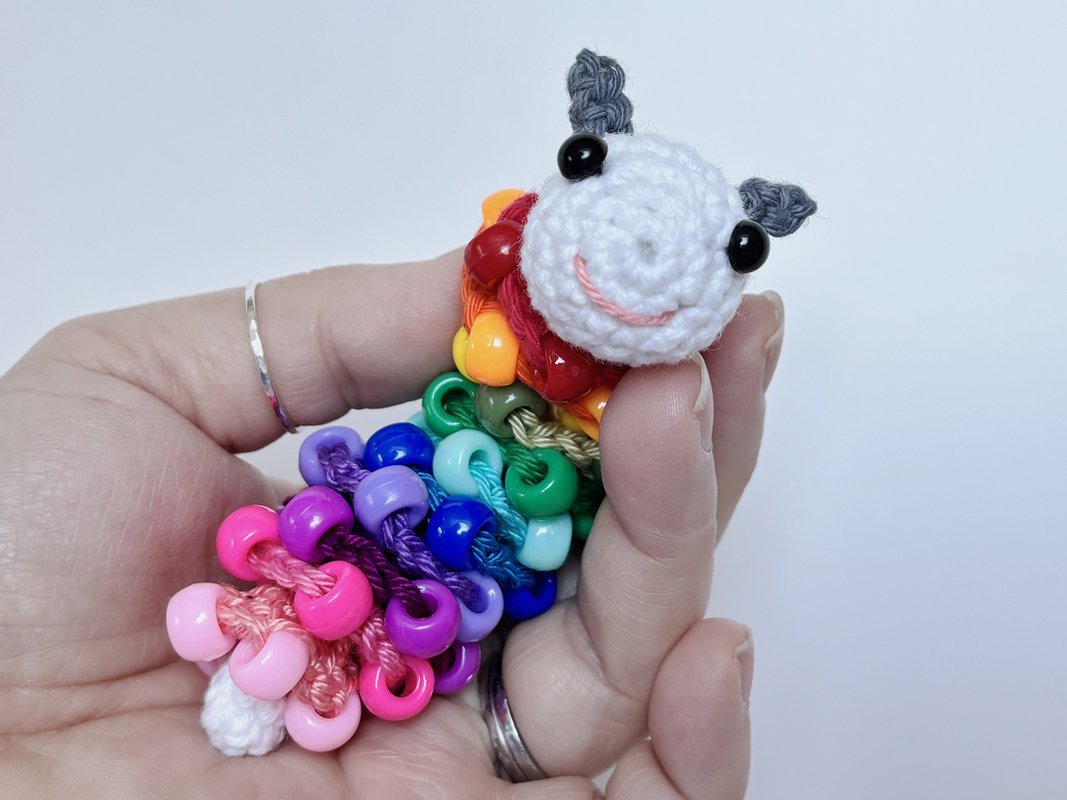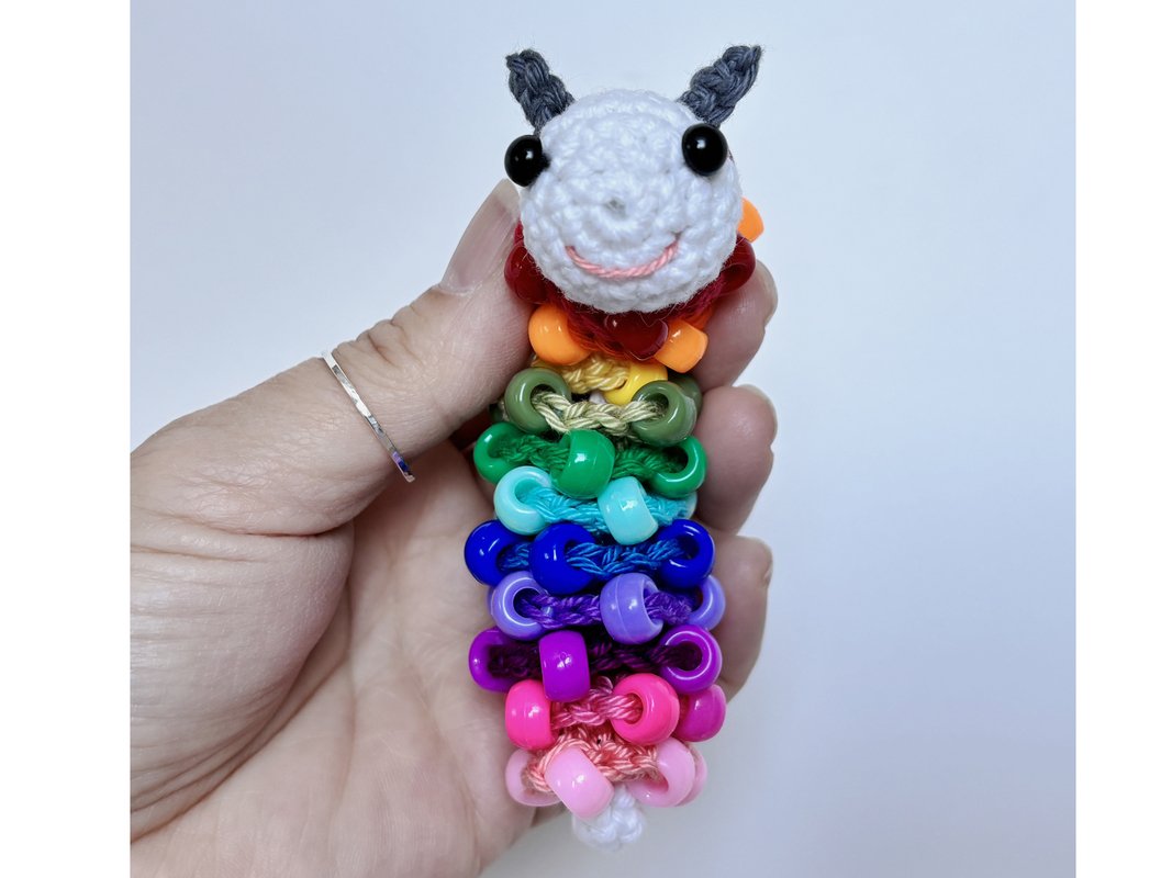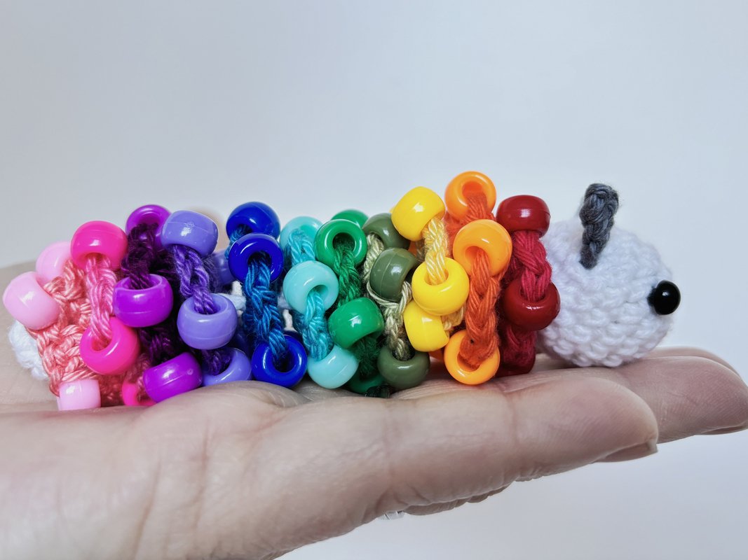 The size of the finished worm depends on the yarn you use. The thicker the yarn, the larger the caterpillar will be. Using cotton yarn with 150 m/50 g, the worm will be approximately 10 cm long.