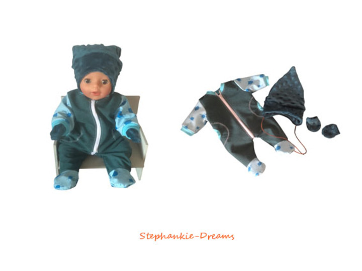 The suit is made from quilted fabrics that are lined with cuddly fabric or regular fabric on the inside, as well as from softshell, terry cloth, or cozy materials such as wellness fleece or alpine fleece. The hat and mittens are sewn from terry cloth, wellness fleece, alpine fleece, fleece, or minky fleece.