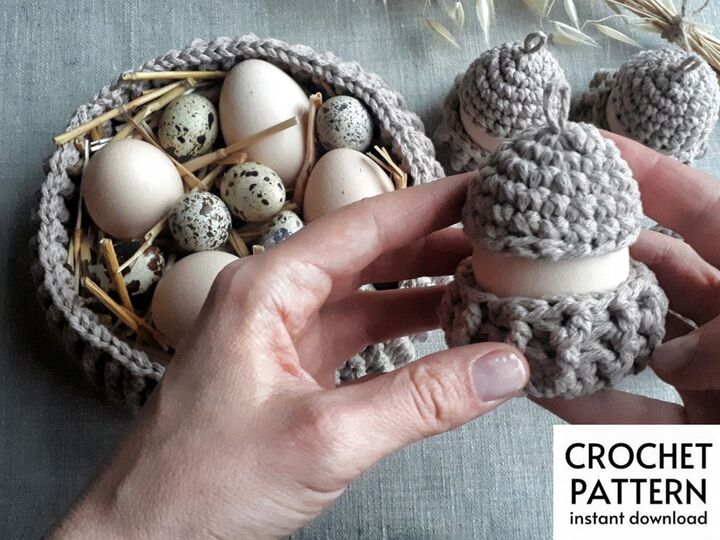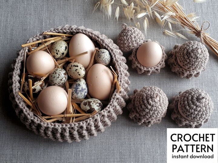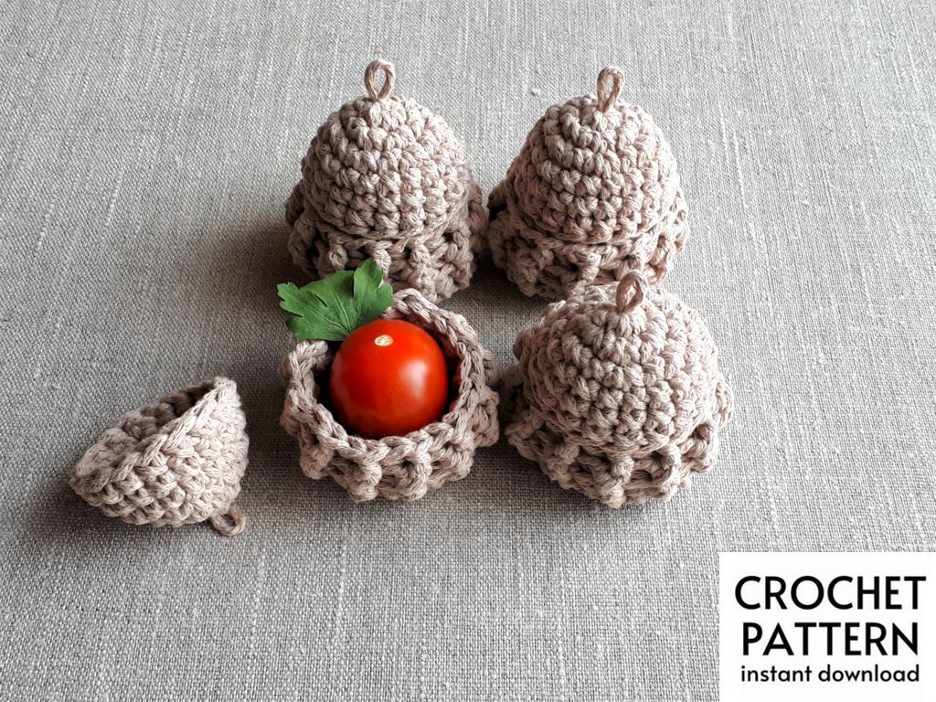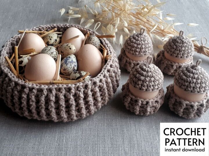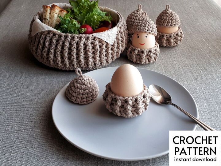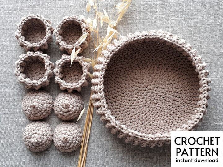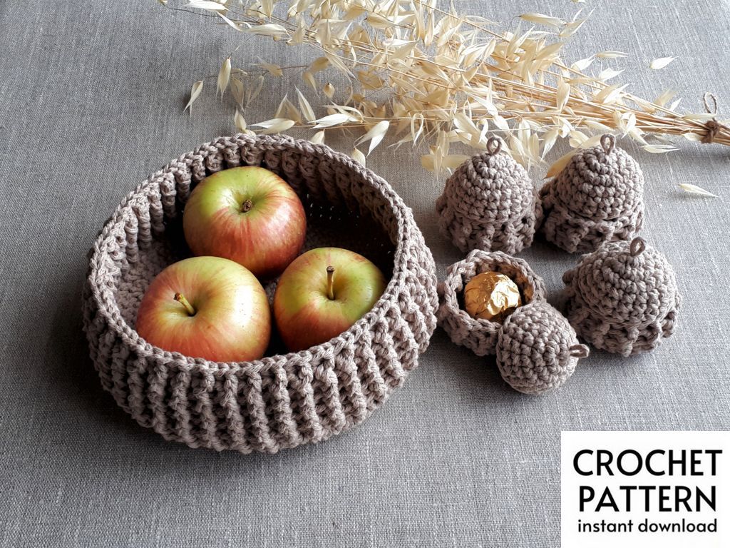 Crochet basket set pattern. It is a great idea of Easter table decoration. You can make small Easter Diy basket with an egg hat to each person. The round kitchen basket DIY set can be also used in common life: just put fresh vegetables or fruits, or candies in it.