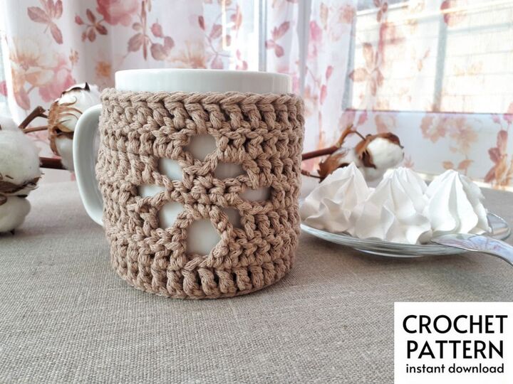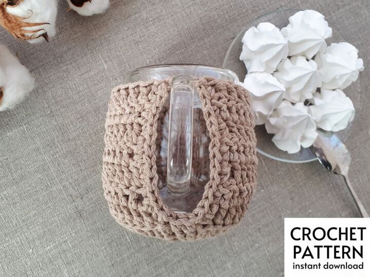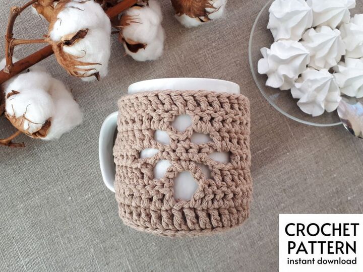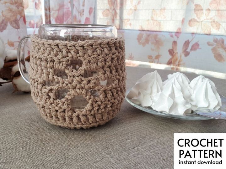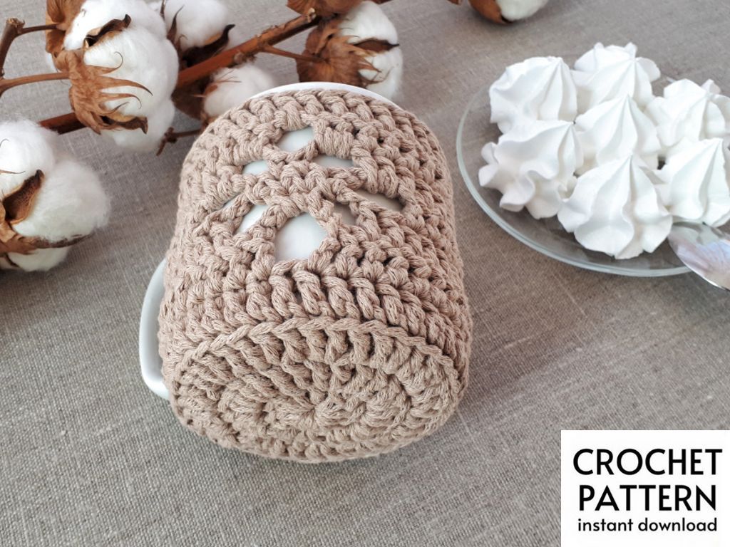 Cup cozy crochet pattern with bottom. It will keep your coffee or tea warm, make your cup stylish and cheer up you. Mug cozy crochet pattern is a nice idea for table setting and is a good gift for Birthday, Easter, Thanksgiving day, Birthday, Mother's day, Father's day, New year, Christmas, for your friends and family. This DIY reusable cup sleeve is easy and fast to make.