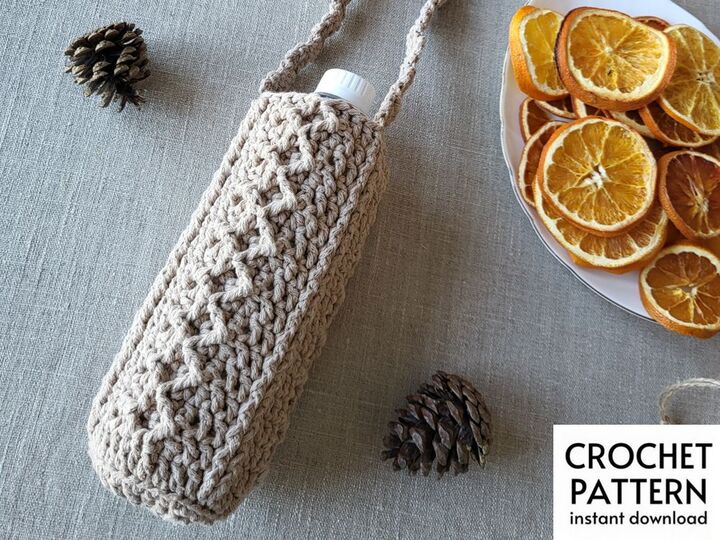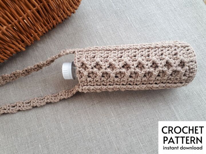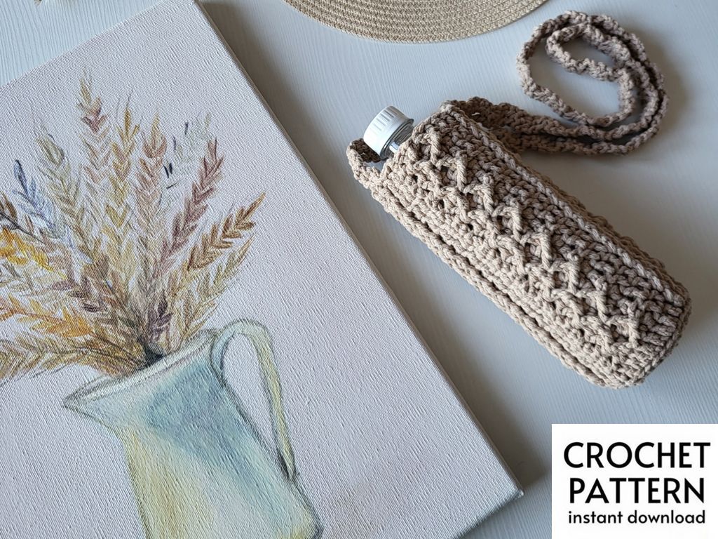 The crochet water bottle holder pattern. The crochet water bottle holder is so useful for a walk. You can take it to the beach, trip, hiking, picnic.