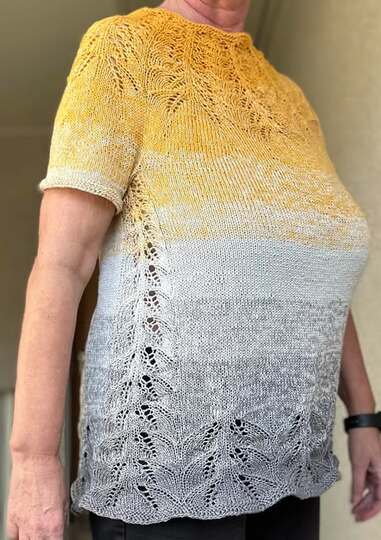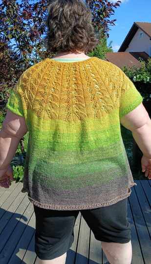 Der Pulli bzw. das Shirt wird in Runden von oben nach (Top Down) unten gestrickt. Die erforderlichen Zunahmen ergeben sich durch das Muster. Top Down ist also eigentlich "nur" eine Zusammenfassung für "von oben nach unten".