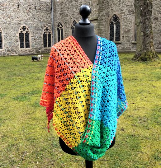 Stole B: 350 g cotton yarn 8/4, 170 m/50 g, 7 skeins in 7 different rainbow colours,