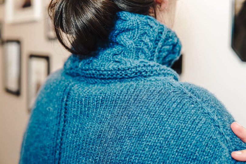 You start at the neck. First, it is knitted in the round before using short rows to improve the fit. At the same time, you begin increasing stitches for the front and back panels, which help shape the shoulder line. Once the full shoulder width is reached, the front and back panels are finished separately. Both parts taper slightly downward through decreases.
