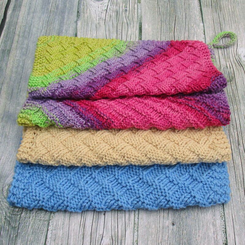The diagonal basketweave pattern looks stunning from both sides. They are a real eye catcher, whether you choose to use a gradient yarn, thus creating diagonal colour stripes and texture or a solid colour with just diagonal texture. A pair makes decorative potholders as well.