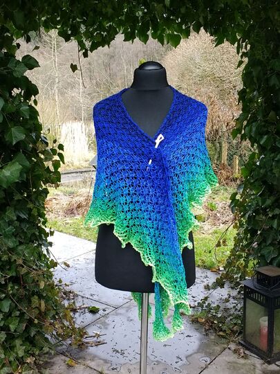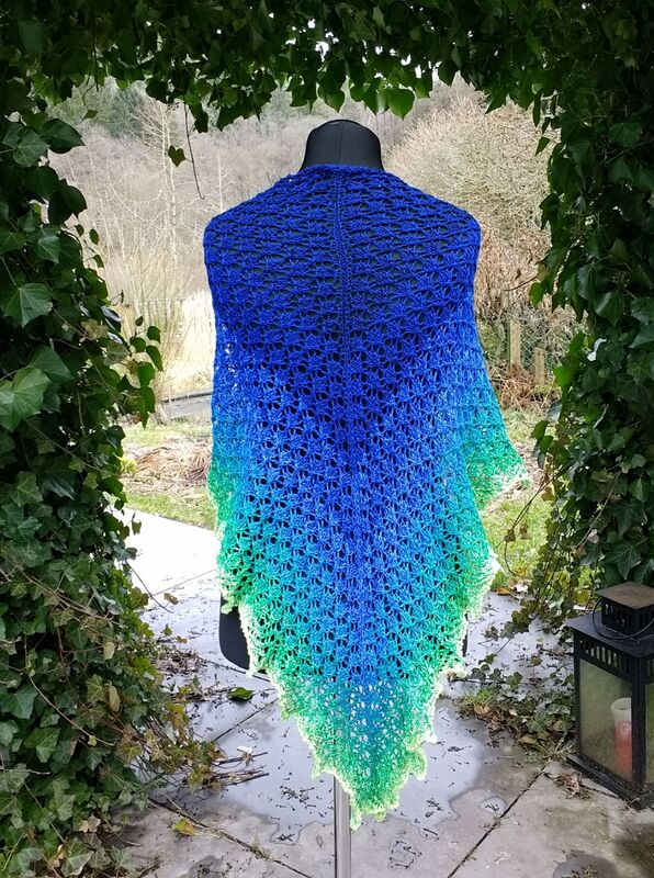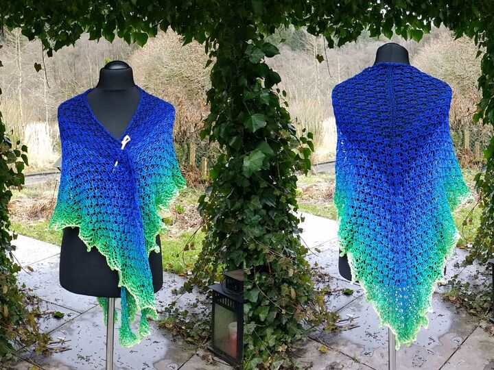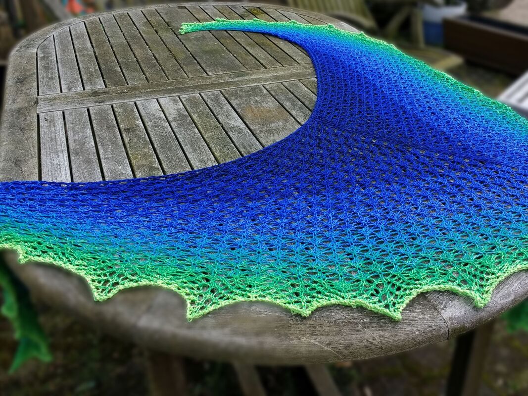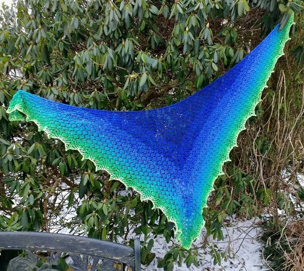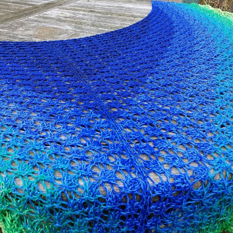 Bluegreen Shawl: 200 g gradient yarn cake, 750 m yardage/200g; circular needles 5 mm (US8), stitch markers