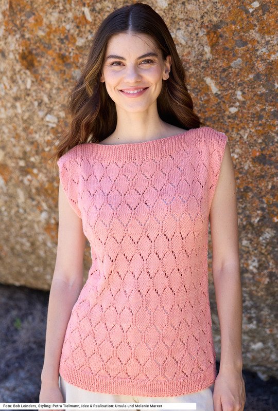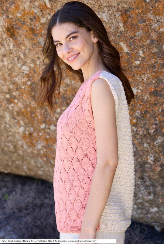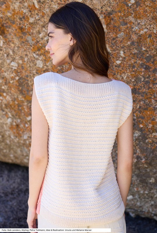 Dieses Top beweist, dass ein raffiniertes Design auch unkompliziert sein kann. Die beiden Teile sind jeweils mit einem Allover-Muster geschmückt, mal Ajour, mal Querrippen aus rechten und linken Maschen. Zudem ist das Modell in zwei Farben gehalten, was mehr Kombinationsmöglichkeiten eröffnet – je nach Lust und Laune kommt mal die eine, mal die andere Seite nach vorne bzw. hinten. Das geht deswegen, weil Vorder- und Rückenteil exakt denselben Schnitt mit einem U-Boot-Ausschnitt haben. An den Armausschnitten wird ein I-Cord-Rand angestrickt. Die Anleitung ist für die Größen 36/38, 40/42 und 44/46.