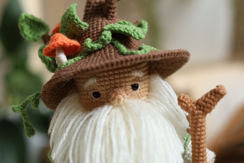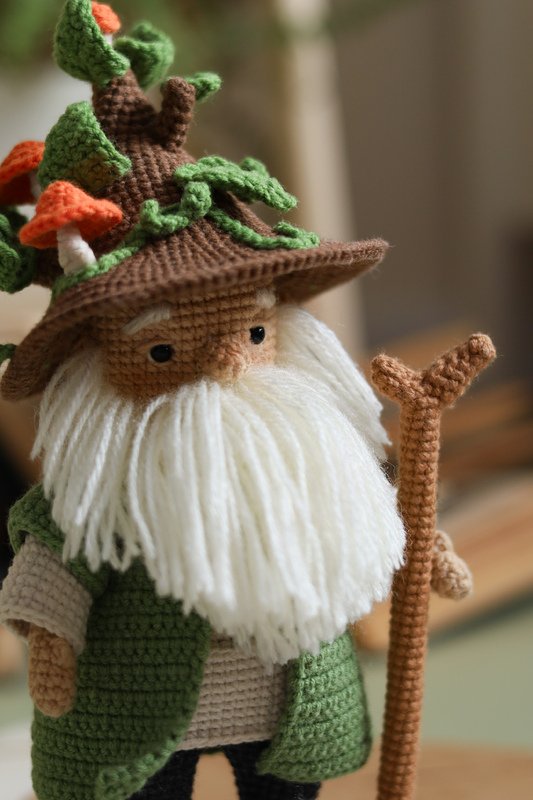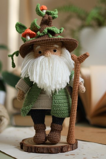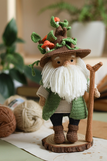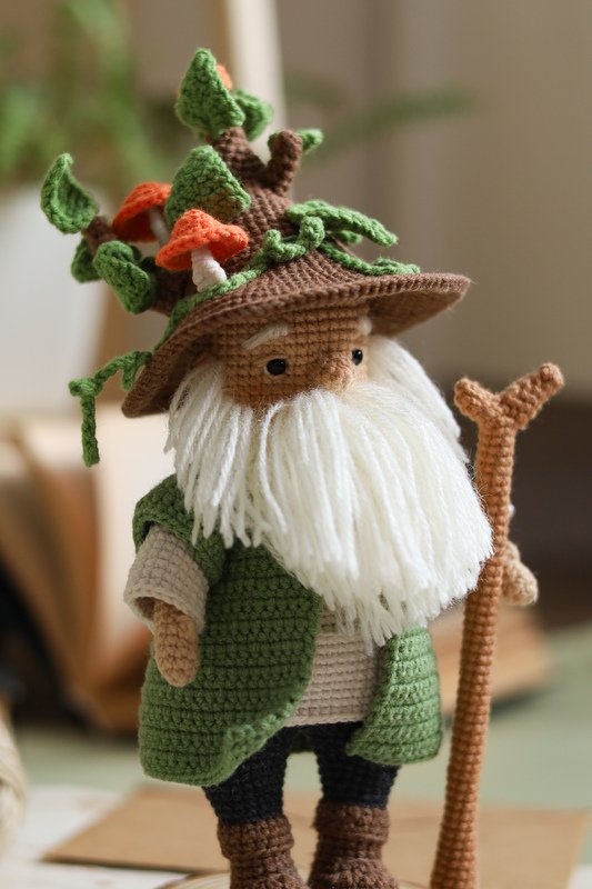 This is an AMIGURUMI DOLL CROCHET PATTERN, which will help you to make this cute forest spirit represented as an old man with a beard and wearing fairy-tail hat and a staff.