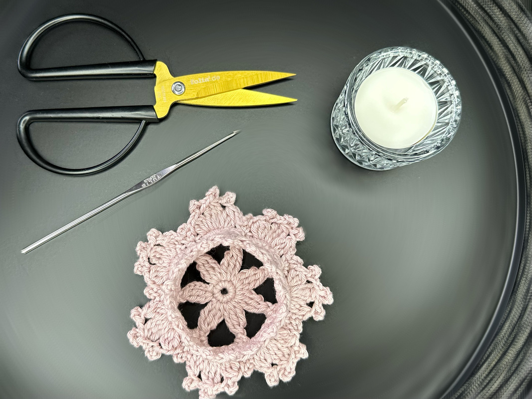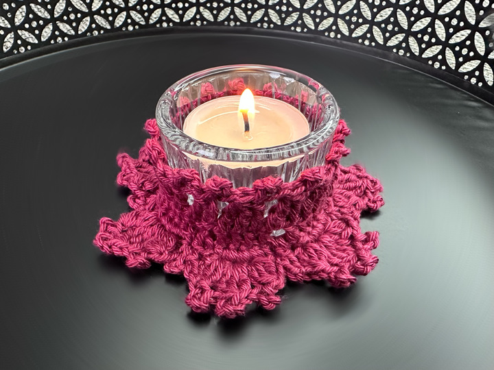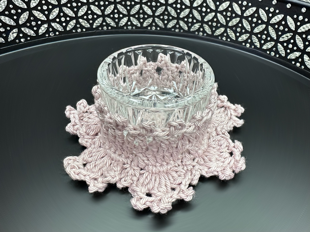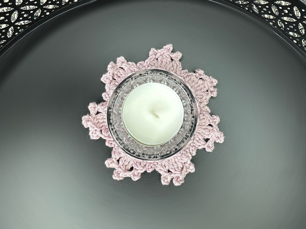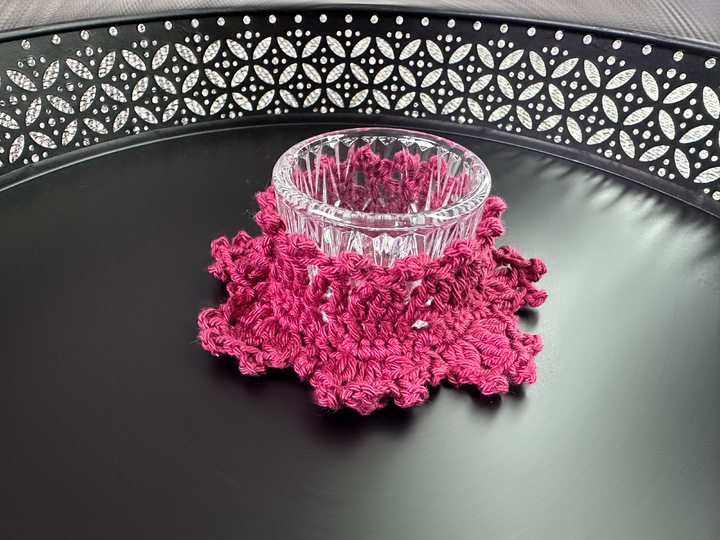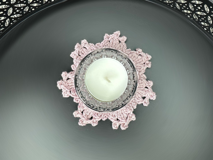 The finished crochet candle holder measures 10 cm (3.94 in) in diameter and 3 cm (1.18 in) in height.