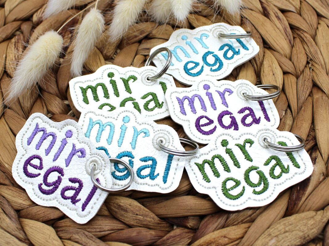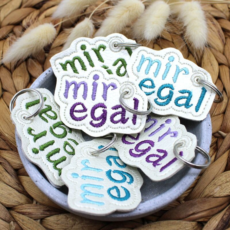 ITH Stickdatei für einen Schlüsselanhänger mit Schriftzug "mir egal"