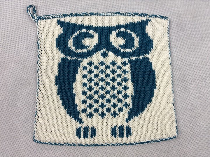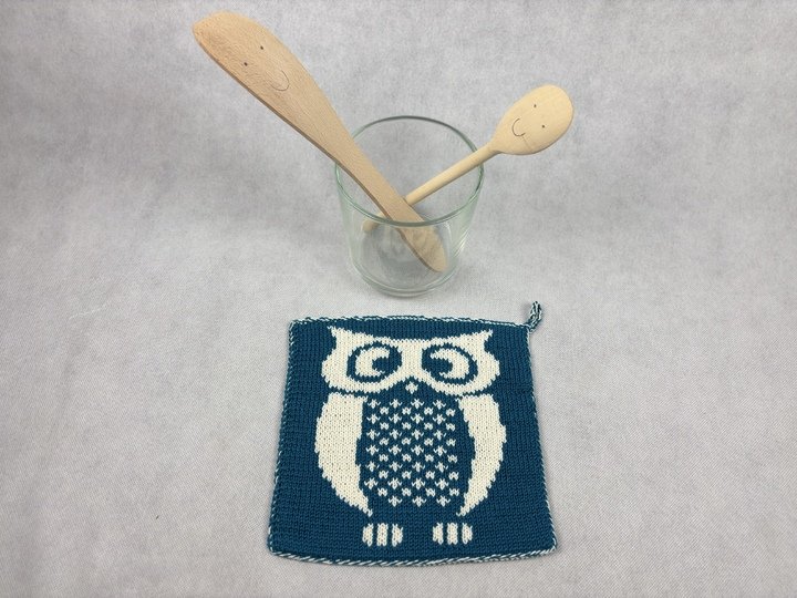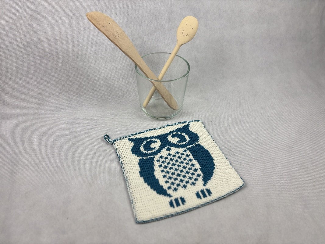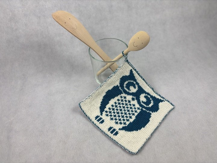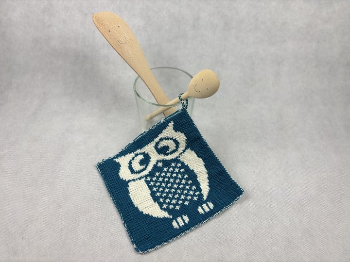 This beautiful owl is called Eugen. A great motif for potholders where he likes to protect your hands from excessive heat. The potholder is knitted using the double face technique and is therefore beautiful on both sides. A real ornament for any kitchen. It would make a great gift for the next invitation to a fine meal, wouldn't it?