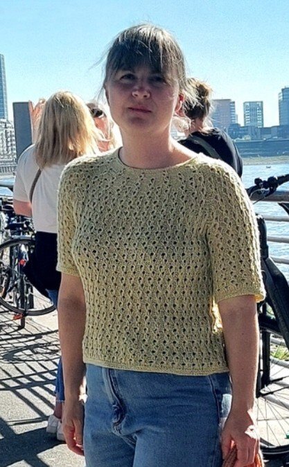 For a short-sleeved blouse with a side length of 38 cm (15 inches) and sleeve length of 14 cm (5.5 inches), you need around 530 / 570 (620 / 670 / 700) (770 / 840 / 910) (1020 / 1140 / 1230) m (580 / 620 (680 / 730 / 760) (840 / 920 / 990) (1110 / 1240 / 1340) yds of sport weight yarn (sample tee is size 3, with only 33 cm (13 inches) side and 16 cm (6.25 inches) sleeve length).