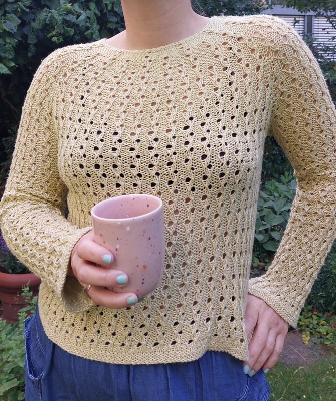 The ALESIA blouse features a small all-over lace rib motif, created only with the help of yarnovers and decreases. This circular yoke blouse is worked top-down, starting with a garter stitch crew neck. Increases are worked to establish columns of lace rib motifs, one after the other, evenly spaced across the yoke. After several rounds, you will mark 4 raglan positions and work raglan increases. This hybrid construction combines the snug fit of a circular yoke around the upper body (neck and shoulders) with the tailored ease of raglan increases, creating additional width at the lower underarm for optimal arm mobility.