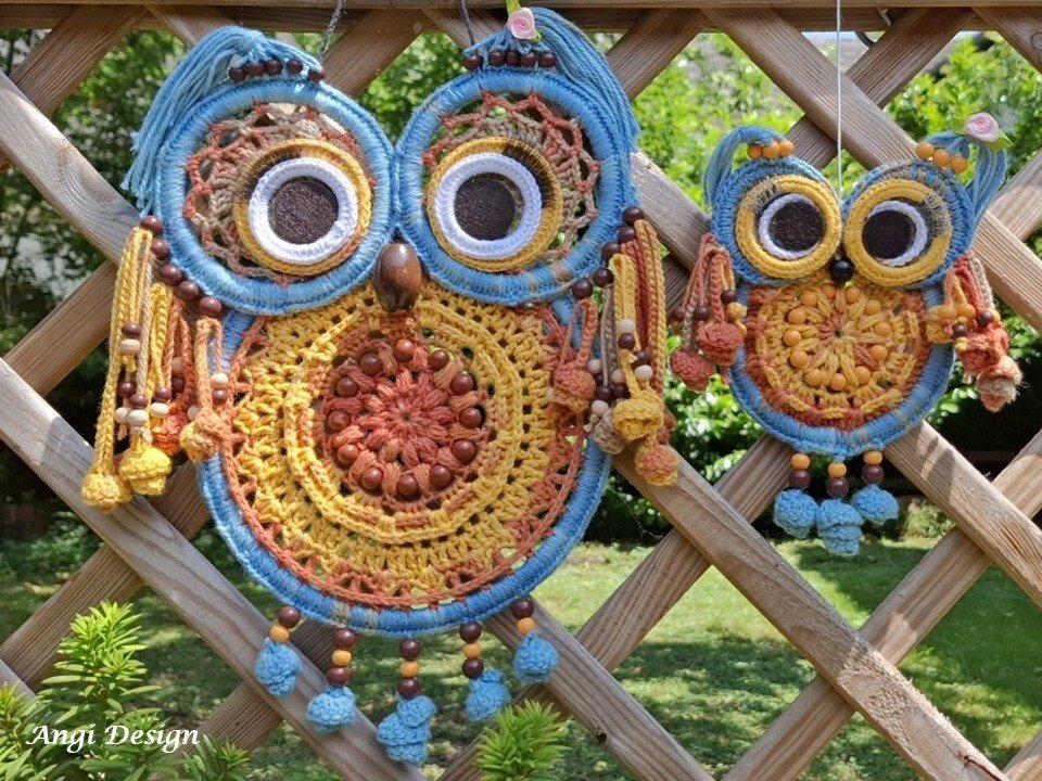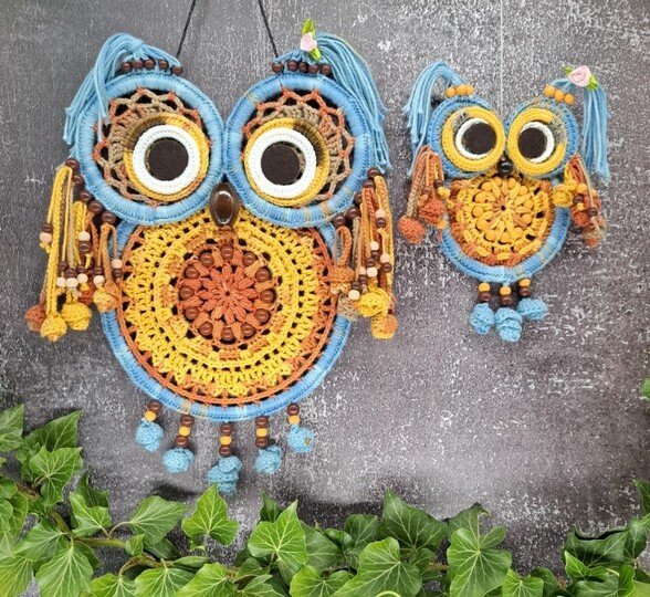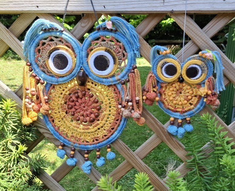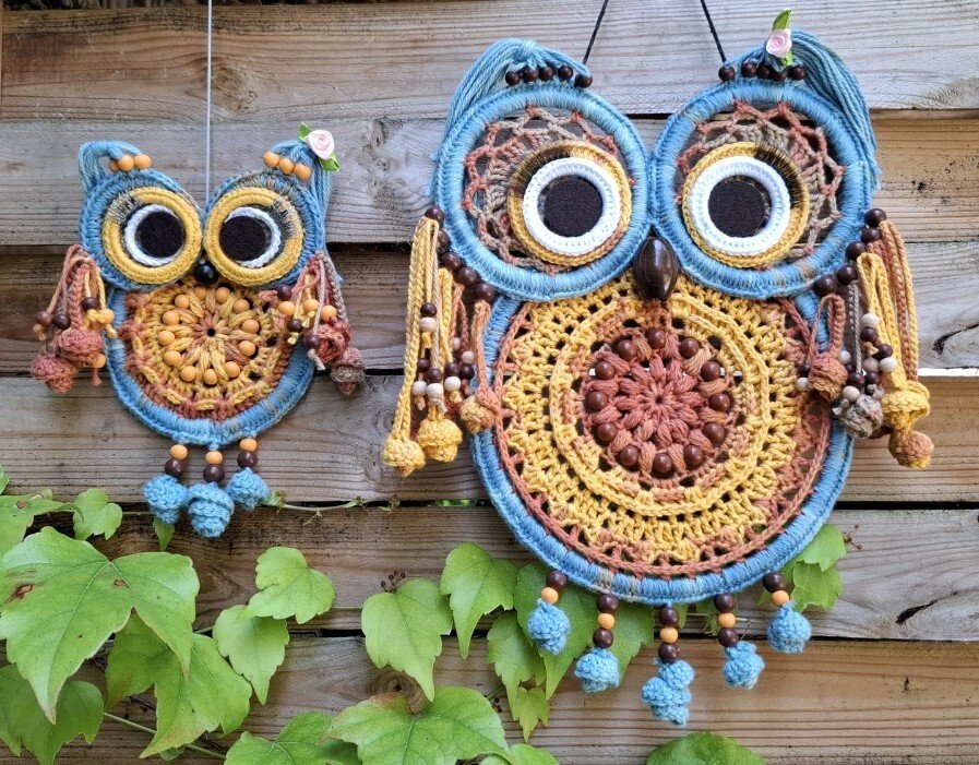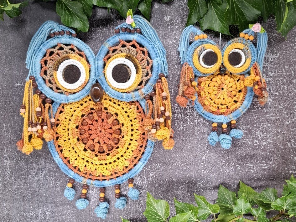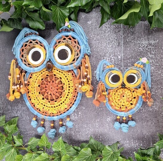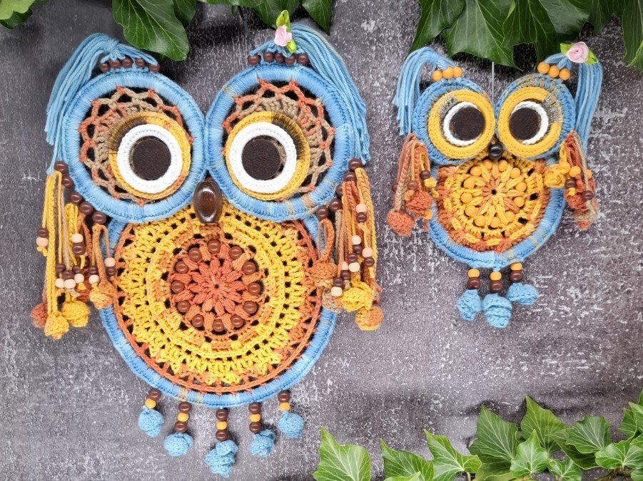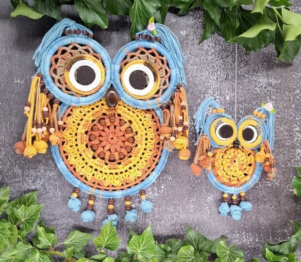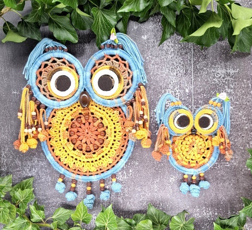 Du erhältst eine ausführliche Häkelanleitung für diese 2 bezaubernden Eulen. Du kannst sie mit gehäkelten Schmuckteilen herstellen, oder mit Federn verzieren.