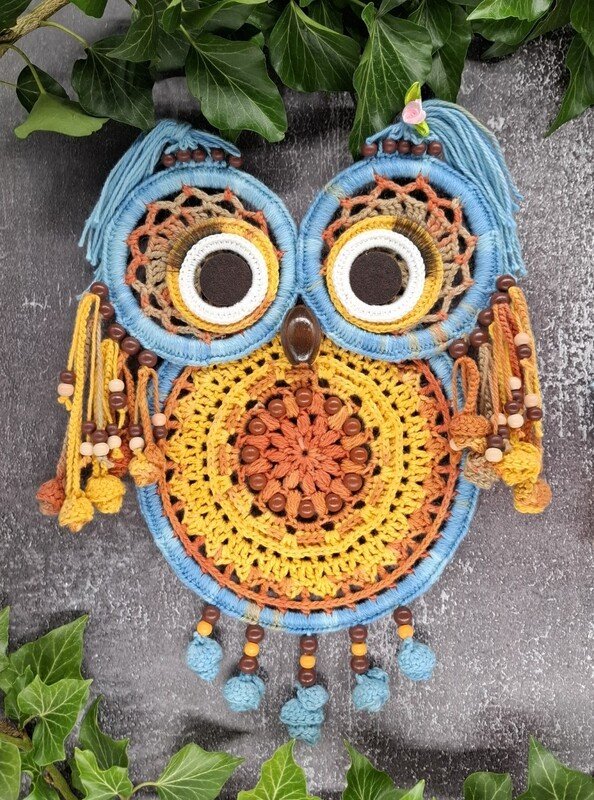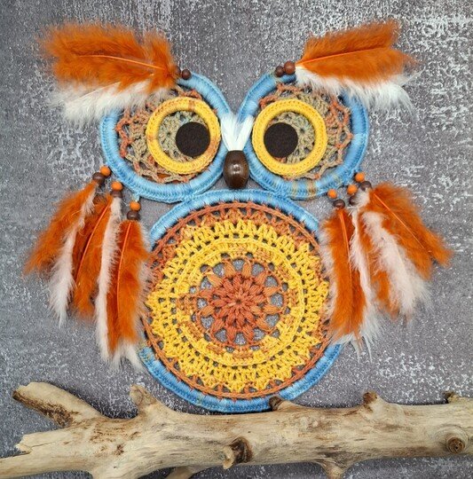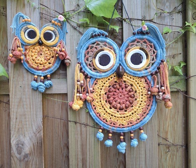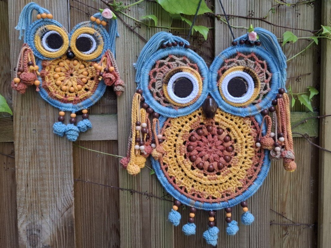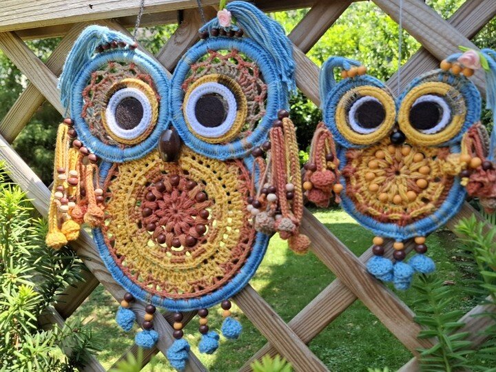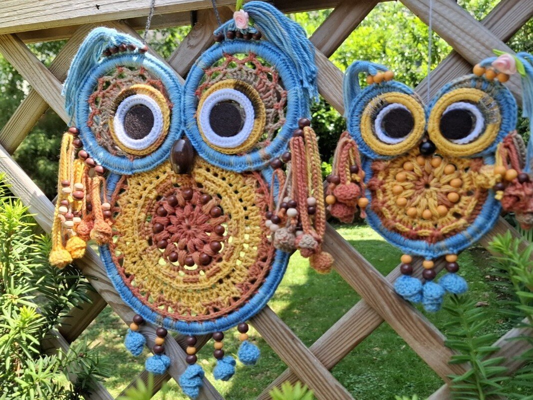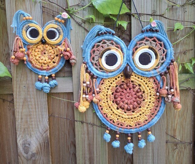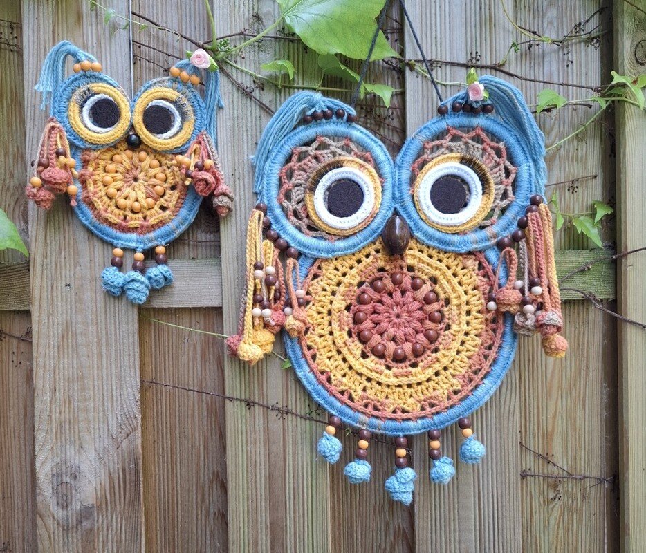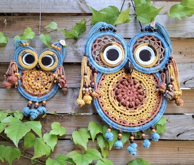 Du erhältst eine ausführliche Häkelanleitung für diese 2 bezaubernden Eulen. Du kannst sie mit gehäkelten Schmuckteilen herstellen, oder mit Federn verzieren.
