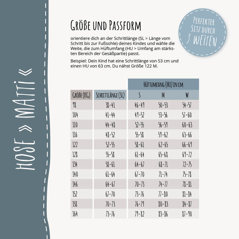 Der Schnitt enthält die Größen 98 bis 164 in je 3 Weiten.