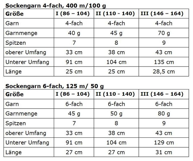 4-ply sock yarn, 40 to 70 g, depending on the size (see photos, tables)