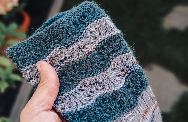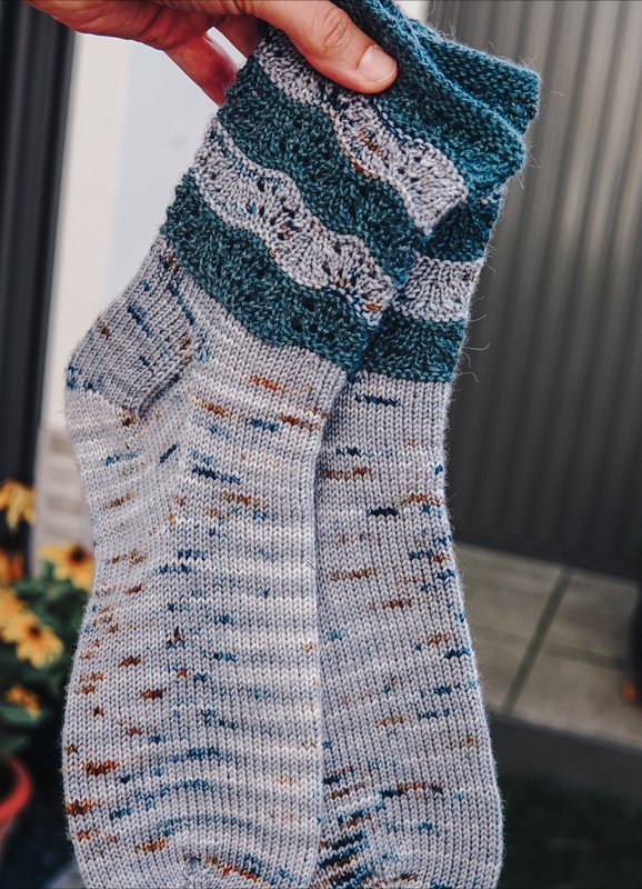You knit "toe-up," starting at the tip. The entire foot remains in stockinette stitch, so nothing will bother you inside your shoes. After knitting the heel, the playful lace pattern begins on the leg. The pattern is particularly emphasized by alternating different colours.