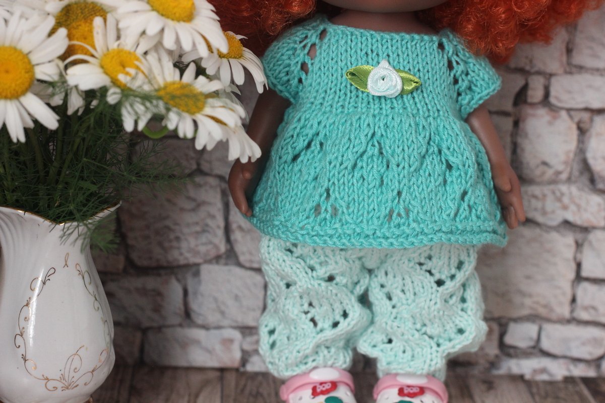 The set consists of a lovely shirt and pants. The shirt is knitted in a single piece from the top-down. Has a velcro fastener. An ideal gift for the little dolls´ owners! The seamless pants are also knitted from the top-down.