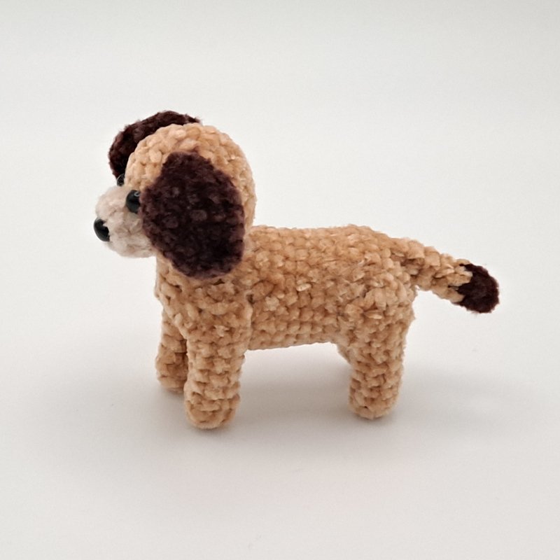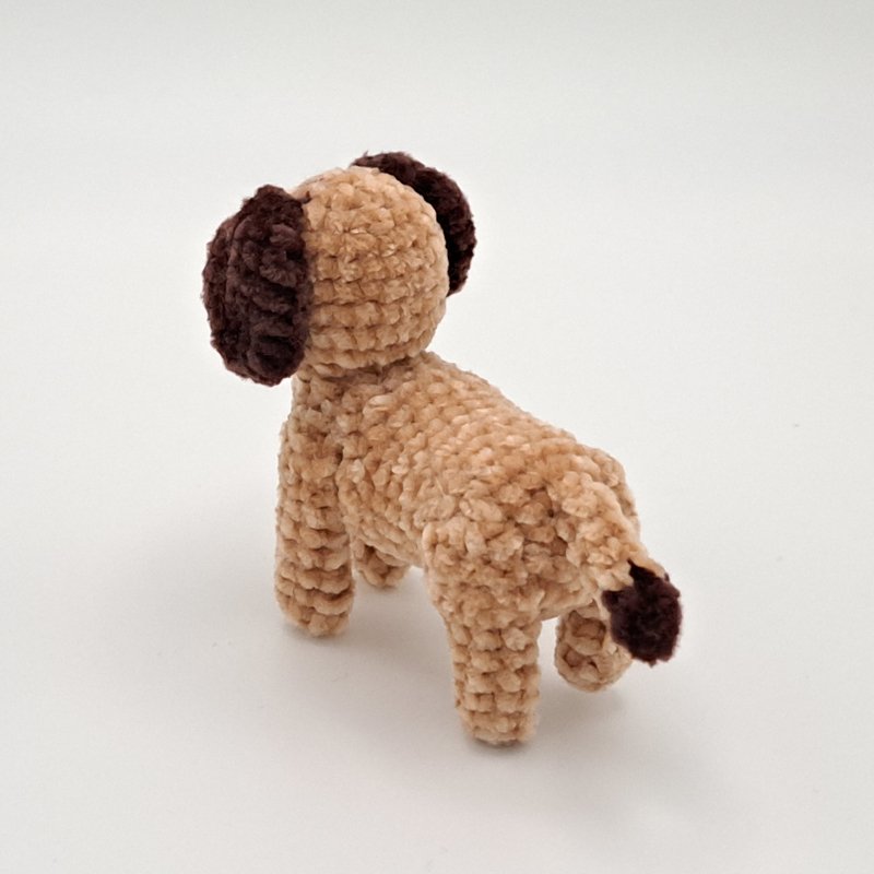 Using a 2,0mm-crochet hook and a 2,0mm-velvet-yarn, the animal will be about 7,5 cm long and 7 cm tall.